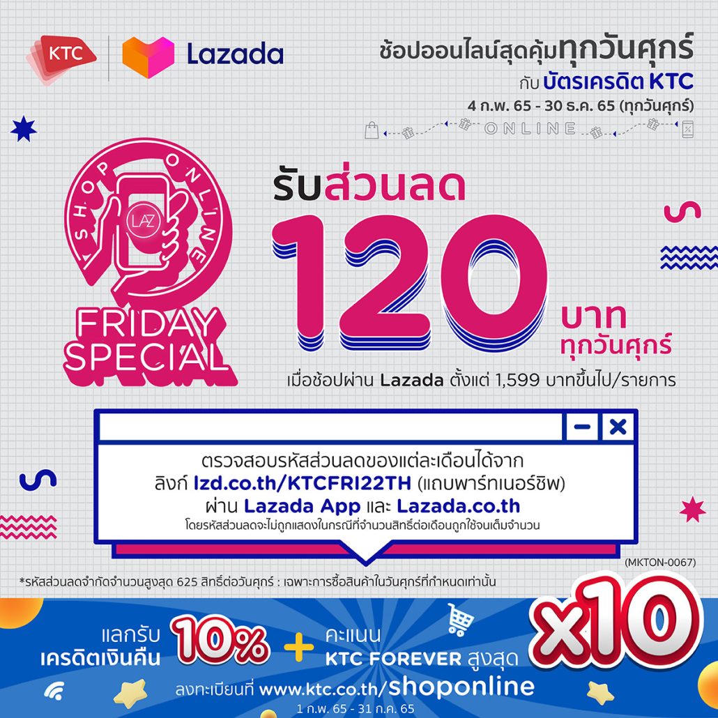“เคทีซี” หรือ บริษัท บัตรกรุงไทย จำกัด (มหาชน) ร่วมกับ “ลาซาด้า” จัดโปรโมชันสุดคุ้มจุใจ สำหรับสมาชิกบัตรเครดิตเคทีซีทุกประเภท รับส่วนลด 120 บาท ทุกวันศุกร์ กับแคมเปญ “KTC x LAZADA Friday Special” เมื่อช้อปผ่านเว็บไซต์ www.lazada.co.th หรือแอปฯ Lazada ตั้งแต่ 1,599 บาทขึ้นไปต่อยอดซื้อสุทธิ ตั้งแต่วันที่ 4 กุมภาพันธ์ 2565 – 30 ธันวาคม 2565 สูงสุด 625 สิทธิ์ต่อวันศุกร์ โดยสามารถตรวจสอบรหัสส่วนลดแต่ละเดือนได้ที่ลิงค์ lzd.co/KTCFRI22TH คุ้มต่อกับการแลกรับโค้ดส่วนลดลาซาด้ามูลค่า 200 บาท ผ่านแอปฯ KTC Mobile เมื่อใช้จ่ายขั้นต่ำ 1,000 บาท โดยใช้ 999 คะแนน KTC FOREVER ในการแลกรับ ตั้งแต่วันที่ 15 กุมภาพันธ์ 2565 – 30 เมษายน 2565 หรือจนกว่าจะครบจำนวน รายละเอียดเพิ่มเติมคลิก https://ktc.today/Lazada-promo