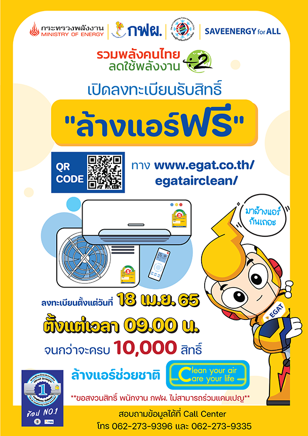 กฟผ. ชวนคนไทยรวมพลังลดใช้พลังงาน ล้างแอร์ฟรี 10,000 สิทธิ์ ทั่วประเทศ เริ่มใช้สิทธิ์ได้18 เม.ย. 65 ตั้งแต่เวลา 09.00 น.