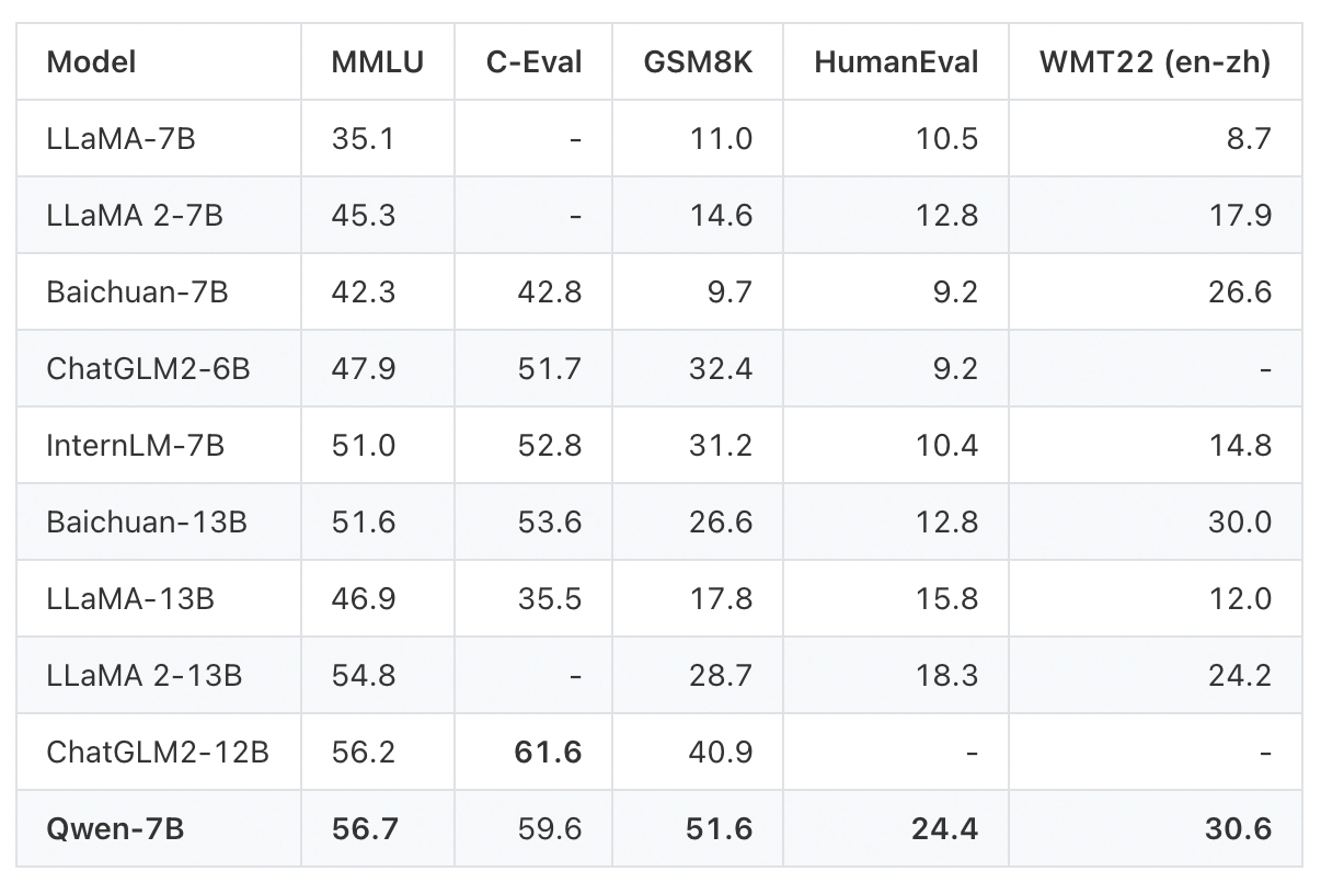 โมเดลพรี-เทรนด์ Qwen-7B นี้มีความเป็นเลิศในการวัดเกณฑ์มาตรฐานการทำความเข้าใจเรื่องต่าง ๆ ในภาษาหลากหลาย (Massive Multi-task Language Understanding: MMLU) ด้วยคะแนน 56.7 ซึ่งเหนือกว่าโมเดลพรี-เทรนด์โอเพ่นซอร์สอื่น ๆ ที่มีสเกลใกล้เคียงกันหรือแม้แต่โมเดลที่มีขนาดใหญ่กว่าบางโมเดล การวัดประสิทธิภาพนี้ได้ประเมินความแม่นยำของโมเดลข้อความ ในเรื่องของการทำงานหลายอย่างพร้อมกัน ด้วยงาน 57 งานที่ครอบคลุมสาขาต่าง ๆ เช่น คณิตศาสตร์พื้นฐาน วิทยาการคอมพิวเตอร์ และกฎหมาย นอกจากนี้ Qwen-7B ยังได้รับคะแนนสูงสุดในบรรดาโมเดลที่มีพารามิเตอร์เทียบเท่ากันในลีดเดอร์บอร์ดของ C-Eval ซึ่งเป็นชุดการประเมินภาษาจีนที่ครบถ้วนสำหรับโมเดลพื้นฐานต่าง ๆ ชุดการประเมินนี้ครอบคลุม 52 วิชาในสี่สาขาวิชาเฉพาะ ได้แก่ มนุษยศาสตร์ สังคมศาสตร์ STEM และอื่น ๆ Qwen-7B ยังมีประสิทธิภาพโดดเด่นในการวัดเกณฑ์มาตรฐานทางคณิตศาสตร์และการสร้างโค้ด เช่น GSM8K และ HumanEval อีกด้วย