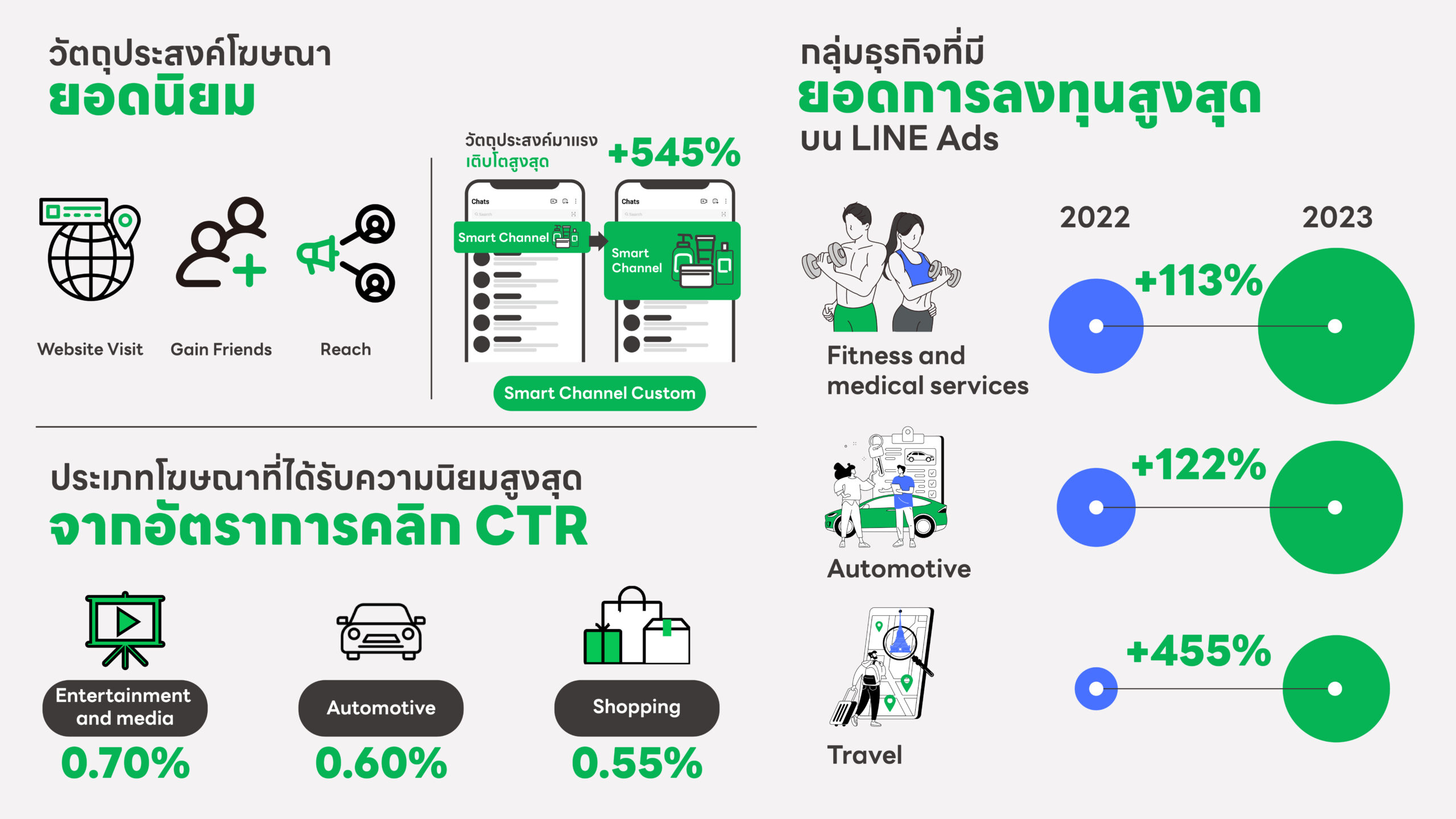 หากมองในด้านของการถูกนำไปใช้งาน LINE Ads ยังคงได้รับความนิยมใช้งานทั้งเพื่อการสร้างแบรนด์และการสร้างยอดขาย โดย 3 อันดับวัตถุประสงค์ที่แบรนด์นิยมใช้งานและเติบโตอย่างต่อเนื่อง คือ การเข้าชมเว็บไซต์ (Website Visit) การเพิ่มเพื่อน (Gain Friends) และการเข้าถึง (Reach) ตามลำดับ และที่ได้รับความสนใจอย่างยิ่งจากธุรกิจ คือ วัตถุประสงค์ใหม่ล่าสุด Smart Channel Custom ที่ปรากฏอยู่บนหน้ารายการแชทที่มาพร้อมกับการแสดงผลโฆษณาที่มีขนาดใหญ่ รองรับทั้งภาพนิ่ง และวีดีโอได้ ทำให้มีอัตราการใช้งานเติบโตสูงสุดเมื่อเทียบกับวัตถุประสงค์อื่นในปีนี้ถึง 545% จาก 3 ธุรกิจหลัก ได้แก่ ธุรกิจอาหารเครื่องดื่ม ธุรกิจเครื่องสำอางค์ และธุรกิจยานยนต์ ตามลำดับ