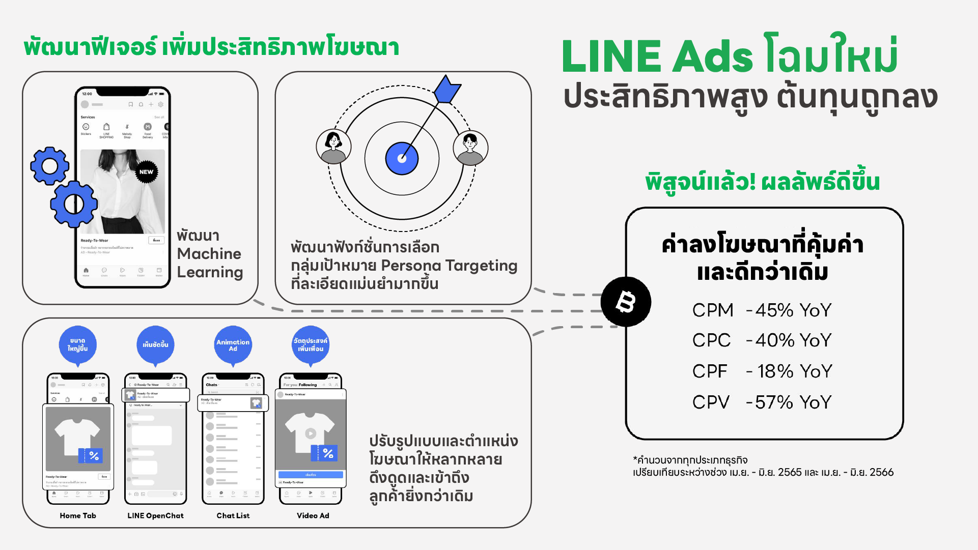 ในปีที่ผ่านมา LINE Ads ได้ปรับโฉมเพื่อพัฒนาประสิทธิภาพโฆษณาให้สร้างผลัพธ์ที่ดีขึ้นด้วยต้นทุนที่ถูกลง โดยมุ่งเน้นพัฒนาใน 3 ด้าน คือ (1) พัฒนา Machine Learning มุ่งทำให้ระบบวิเคราะห์ข้อมูลทำงานได้เต็มศักยภาพ ส่งผลให้โฆษณาเข้าถึงกลุ่มเป้าหมายได้ดีขึ้นในราคาที่ถูกลง (2) พัฒนาฟังก์ชั่นการเลือกกลุ่มเป้าหมาย Persona Targeting ที่ละเอียดแม่นยำมากขึ้น ขยายการมองเห็นโฆษณาได้มากกว่าเดิม และ (3) พัฒนารูปแบบโฆษณาให้หลากหลายกว่าเดิม ช่วยดึงดูดให้ลูกค้าสนใจและจดจำ พร้อมตำแหน่งโฆษณาที่เข้าถึงลูกค้าได้ทุกช่วงเวลา นำไปสู่ผลลัพธ์ที่เหนือกว่า โดยการพัฒนาที่เกิดขึ้นอย่างต่อเนื่องนี้ สะท้อนสู่ผลลัพธ์เชิงธุรกิจที่มีประสิทธิภาพ คุ้มค่ายิ่งขึ้น ด้วยต้นทุนที่ถูกลง ไม่ว่าจะเป็น CPM ลดลง 45% ต้นทุนต่อคลิกหรือ CPC ลดลง 40% ต้นทุนต่อการเพิ่มเพื่อนหรือ CPF ลดลง 18% และต้นทุนต่อการดูวิดีโอหรือ CPV ลดลง 57% โดยเปรียบเทียบข้อมูลในช่วงเดียวกันระหว่างปี 2022 กับ 2023