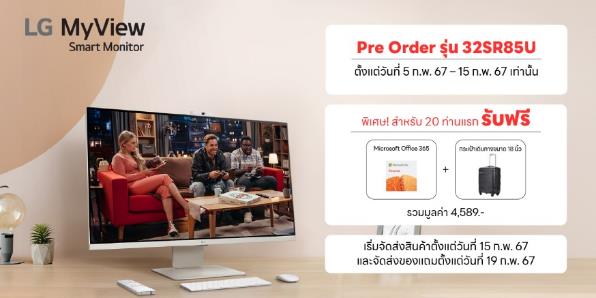 LG MyView Smart Monitor รุ่น 32SR85U ขนาด 32 นิ้ว มาในราคา 26,900 บาท พร้อมข้อเสนอสุดพิเศษเมื่อสั่งสินค้าแบบพรีออร์เดอร์ในช่วงเปิดตัว ตั้งแต่วันที่ 5-15 กุมภาพันธ์ 2567 รับของแถมสุดพิเศษ โปรแกรม Microsoft 365 Personal 1 ปี และกระเป๋าเดินทางขนาด 18 นิ้ว รวมมูลค่า 4,589 บาท[3] สามารถสั่งซื้อได้ที่เว็บไซต์https://www.lg.com/th/monitors/smart-monitors/32sr85u-w/