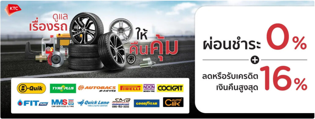เคทีซี ส่งแคมเปญสุดพิเศษสร้างประสบการณ์ความคุ้มค่าในการดูแลซ่อมบำรุงรถยนต์แก่สายรักรถ โดยมอบสิทธิผ่อนชำระ 0% นานสูงสุด 10 เดือน ลดและรับเครดิตเงินคืนสูงสุด 16% สำหรับสมาชิกเคทีซีที่ใช้บริการเปลี่ยนยางรถยนต์ หรือบริการต่างๆ ที่ศูนย์บริการยางรถยนต์ และซ่อมบำรุงรถยนต์ชั้นนำ ตั้งแต่วันที่ 1 มีนาคม 2567 – 31 สิงหาคม 2567