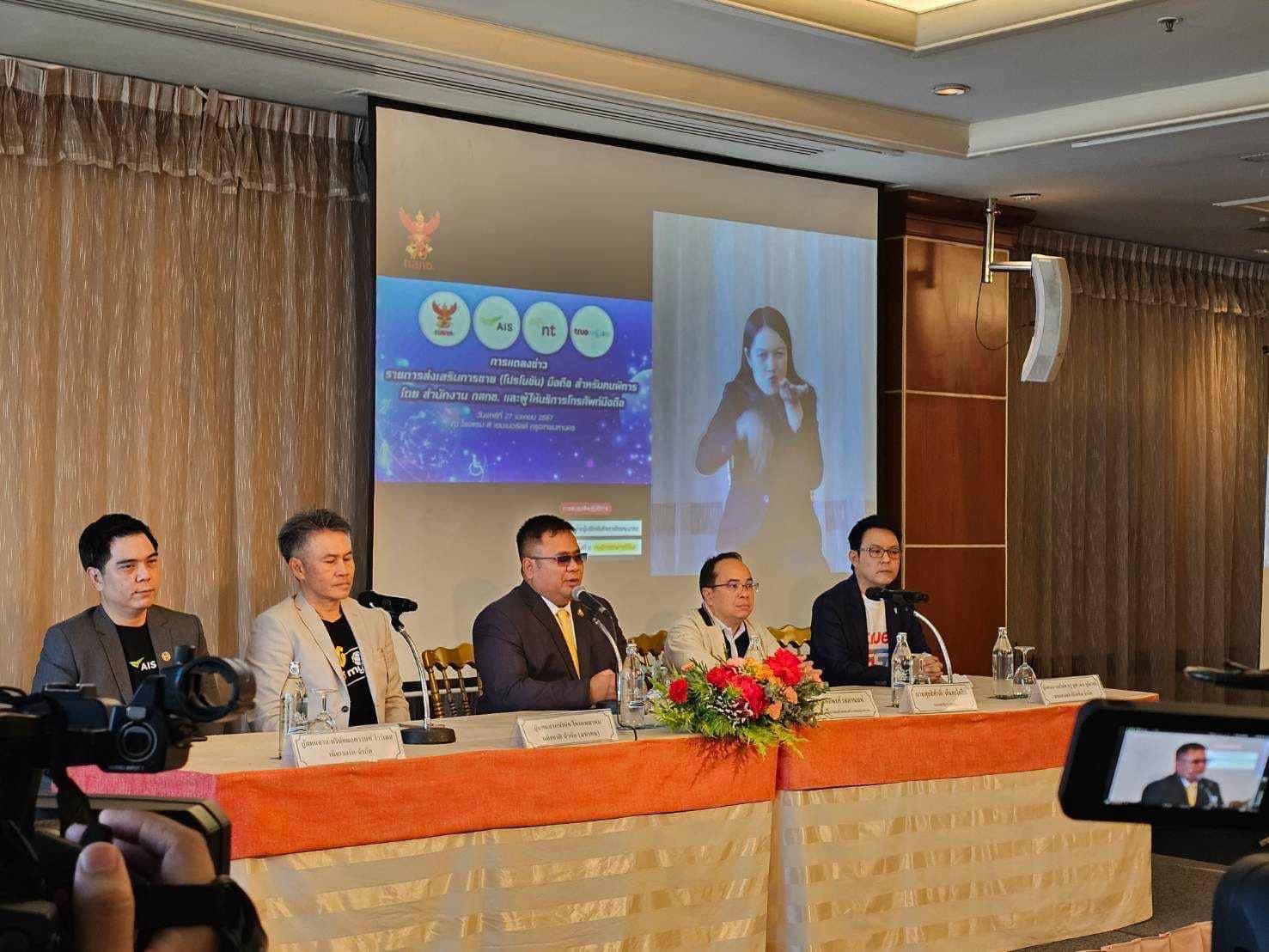 สำนักงานคณะกรรมการกิจการกระจายเสียง กิจการโทรทัศน์ และกิจการ จับมือบริษัท โทรคมนาคมแห่งชาติ จำกัด (มหาชน) หรือ NT พร้อมด้วย AIS และ True Move H จัดงานแถลงข่าวแพ็กเกจโทรศัพท์เคลื่อนที่ และส่วนลดราคา สำหรับผู้พิการ โดยมี นายต่อพงศ์ เสลานนท์ กรรมการกิจการกระจายเสียง กิจการโทรทัศน์ และกิจการโทรคมนาคมแห่งชาติ (กสทช.) เป็นประธาน พร้อมด้วยนายเสกสรรค์ มิตรเกษม รองกรรมการผู้จัดการใหญ่ สายงานการตลาดและผลิตภัณฑ์ NT ร่วมแถลงข่าว ณ โรงแรม ดิ เอมเมอรัลด์ กรุงเทพมหานคร