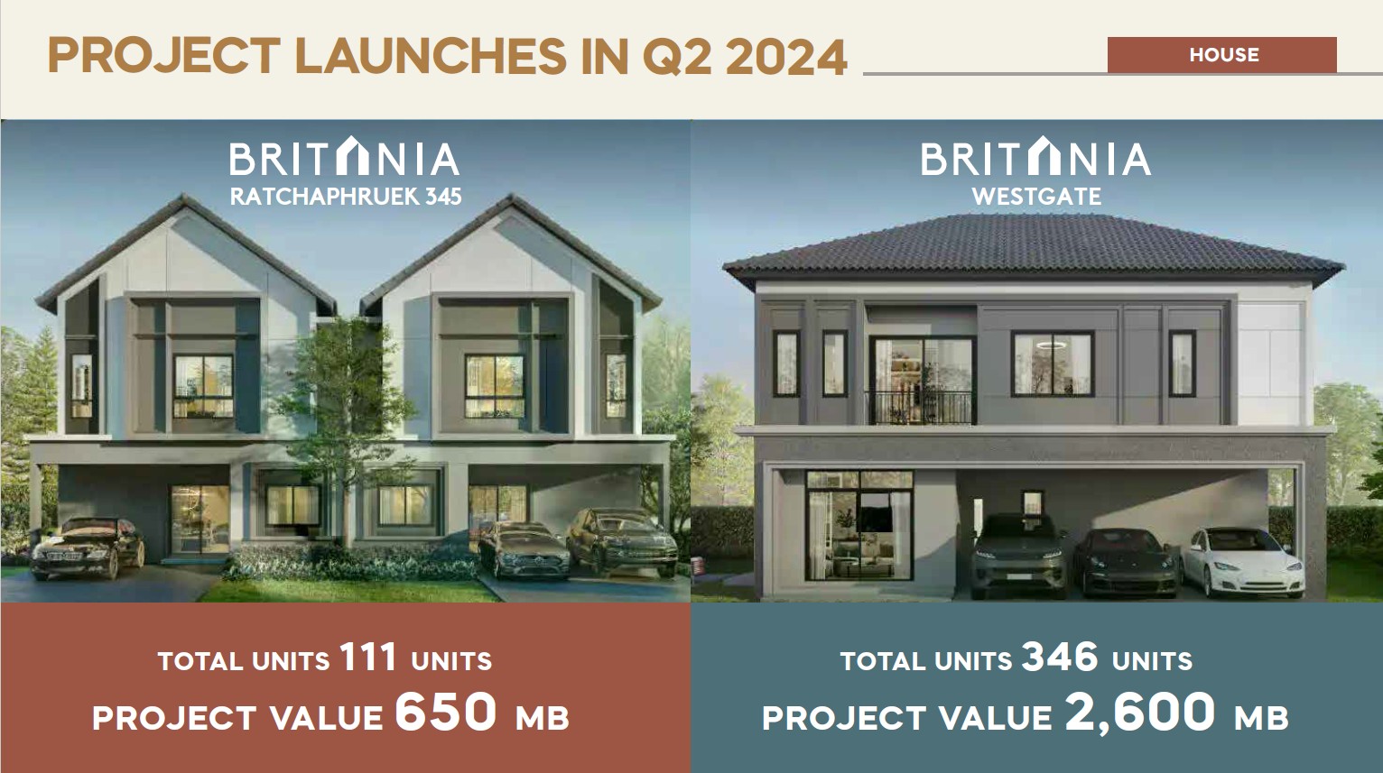 สำหรับกลุ่มบ้านจัดสรรภายใต้บริษัท บริทาเนีย จำกัด (มหาชน) หรือ BRI ให้ความสำคัญกับการเปิดโครงการมิกซ์โปรดักท์ที่ผสมผสานระหว่างบ้านเดี่ยวและบ้านแฝดในโครงการเดียว เน้นเจาะทำเลฝั่งตะวันตกของกรุงเทพฯ ซึ่งเป็นทำเลที่ได้รับการตอบรับดีตั้งแต่ปีที่ผ่านมา รวม 2 โครงการ ได้แก่ 1. บริทาเนีย เวสต์เกต (Britania Westgate) มูลค่า 2,600 ล้านบาท และ 2.บริทาเนีย ราชพฤกษ์ 345 (Britania Ratchaphruek 345) มูลค่า 650 ล้านบาท