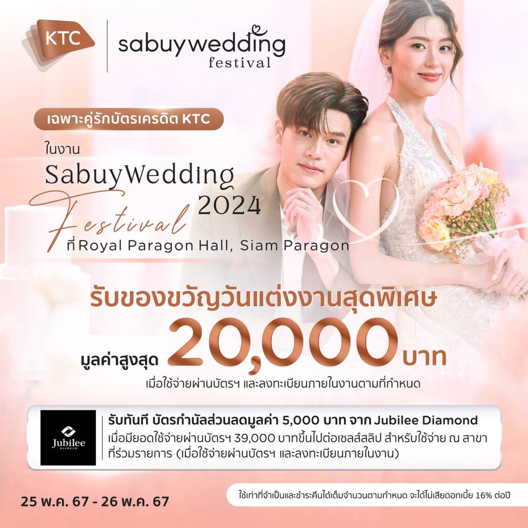 สำหรับการจัดงาน SabuyWedding Festival 2024 มีกำหนดจัดขึ้นระหว่างวันที่ 25 พฤษภาคม 2567 – วันที่ 26 พฤษภาคม 2567 ที่ รอยัล พารากอน ฮอลล์ ศูนย์การค้าสยามพารากอน สามารถดูรายละเอียดเพิ่มเติมได้ที่ https://www.ktc.co.th/promotion/hotel-resort/wedding-package ทั้งนี้คาดว่าจะมียอดรวมการใช้จ่ายผ่านบัตรเครดิตเคทีซีภายในงานดังกล่าวไม่ต่ำกว่า 10 ล้านบาท