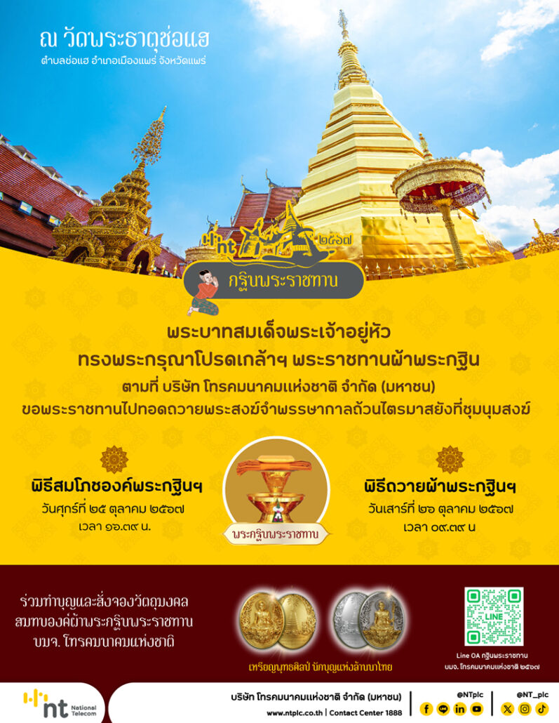 นายสมยศ ธนพิรุณธร รองกรรมการผู้จัดการใหญ่ บริษัท โทรคมนาคมแห่งชาติ จำกัด (มหาชน) หรือ NT ในฐานะประธานกรรมการจัดงานถวายผ้าพระกฐินพระราชทาน ประจำปี 2567 เปิดเผยว่า เนื่องในวโรกาสที่พระบาทสมเด็จพระเจ้าอยู่หัว ทรงพระกรุณาโปรดเกล้าฯ พระราชทานผ้าพระกฐินประจำปี 2567 ตามที่บริษัท โทรคมนาคมแห่งชาติ จำกัด (มหาชน) หรือ NT ขอพระราชทานไปทอดถวายยังที่ชุมนุมสงฆ์ เพื่อน้อมนำไปทอดถวายพระสงฆ์จำพรรษากาลถ้วนไตรมาส ณ วัดพระธาตุช่อแฮ จ.แพร่ โดยกำหนดให้มีพิธีสมโภชองค์พระกฐินฯ ในวันศุกร์ที่ 25 ตุลาคม 2567 เวลา 16.39 น.และมีพิธีถวายผ้ากระกฐินฯ ในวันเสาร์ที่ 26 ตุลาคม 2567 เวลา 09.39 น.