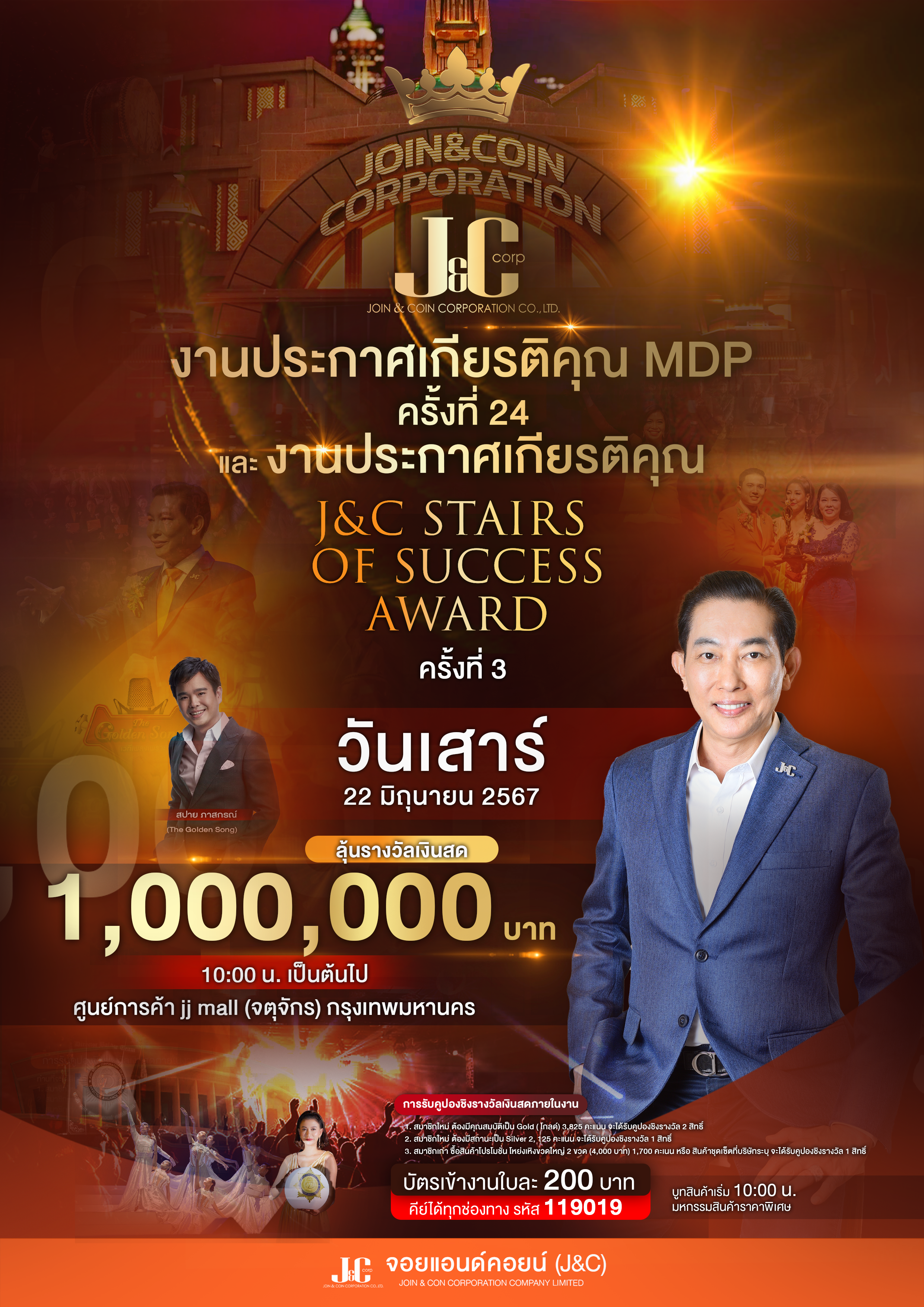 คงต้องร้อง wow!! กันทั่วทั้งงานเป็นแน่กับงานใหญ่ระดับบิ๊กของบิ๊กธุรกิจขายตรงโมเดิร์นเทรด จอย แอนด์ คอยน์ คอร์ปอเรชั่น (J&C) ในงานประกาศเกียรติคุณ MDP ครั้งที่ 24 และงานประกาศเกียรติคุณ J&C STAIRS OF SUCCESS AWARD ครั้งที่ 3 ที่จะจัดขึ้น ณ ศูนย์การค้า JJ Mall (จตุจักร) ในวันเสาร์ที่ 22 มิถุนายน อันใกล้จะถึงนี้ โดยนอกจากจะได้ร่วมแสดงความยินดีกับสมาชิกผู้นำนักธุรกิจที่ประสบความสำเร็จบนเวทีทรงเกียรติแห่งนี้แล้ว ภายในงานครั้งนี้ยังเตรียมรางวัลมากมายรวมมูลค่ามากกว่า 8 แสนบาทไว้เซอร์ไพรส์ให้กับผู้เข้าร่วมงานและยิ่งโดยเฉพาะสาวกสมาชิก J&C และผู้สนใจใครก็ตามที่ต้องการไขว่คว้าโอกาสดี ๆ ทางอาชีพ!! ไม่ควรพลาดด้วยประการทั้งปวง