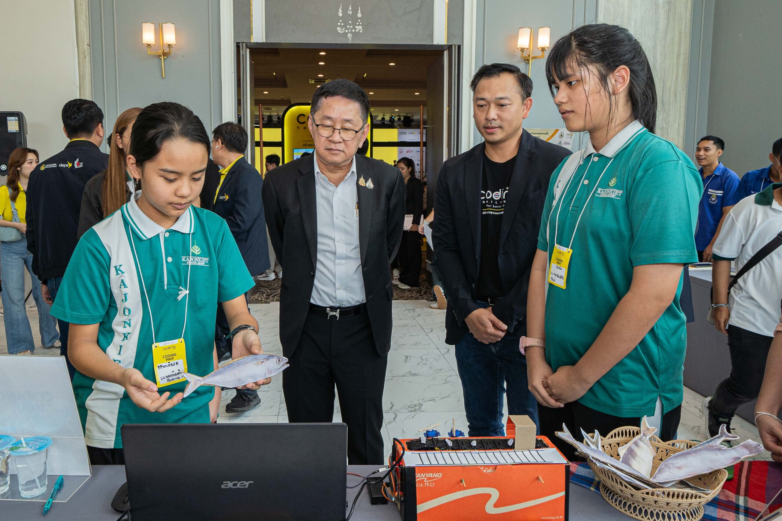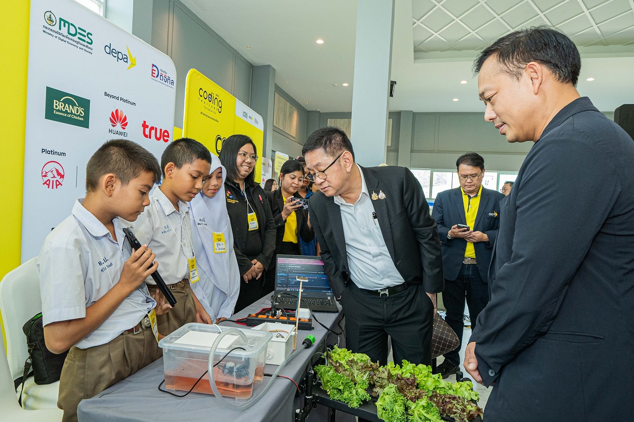 จากนั้น นายประเสริฐ ได้เยี่ยมชมและให้กำลังใจน้อง ๆ นักเรียนและครูที่เข้าร่วมกิจกรรม ‘Coding Bootcamp & Roadshow’ และกิจกรรม ‘Coding War’ พื้นที่ภาคใต้ตอนบน กิจกรรมภายใต้โครงการ Coding for Better Life สร้างรากฐานอนาคตประเทศไทย ดำเนินการ 8 ภูมิภาคทั่วประเทศ ซึ่งโครงการดังกล่าวมุ่งส่งเสริมการสร้างระบบนิเวศดิจิทัลที่พร้อมรองรับการพัฒนาทักษะโค้ดดิ้งผ่านการยกระดับห้องเรียนโค้ดดิ้ง 1,500 โรงเรียนทั่วประเทศ โดยพื้นที่ภาคใต้ตอนบนมีโรงเรียนเข้าร่วมโครงการ 49 โรงเรียน นอกจากนี้ ยังมีการจัดทำหลักสูตรโค้ดดิ้ง พร้อมเสริมทักษะการสอนแก่ครูที่จะเป็นโค้ดดิ้งโค้ช 3,000 คนให้มีเทคนิคพร้อมถ่ายทอดความรู้แก่นักเรียน 300,000 คนต่อปี การเสริมทักษะโค้ดดิ้งเพื่อการพัฒนาเทคโนโลยีและนวัตกรรมดิจิทัลแก่ครูผู้สอนและนักเรียนผ่านกิจกรรม Coding Bootcamp และ Coding War และการสร้างความตระหนักด้านโค้ดดิ้งและการประยุกต์ใช้จริงแก่ผู้ปกครองและประชาชนทั่วไปผ่านกิจกรรม Coding Roadshow รวมถึงการพัฒนาหลักสูตรการเรียนโค้ดดิ้งที่เผยแพร่ผ่านระบบการศึกษาทางไกลผ่านดาวเทียม