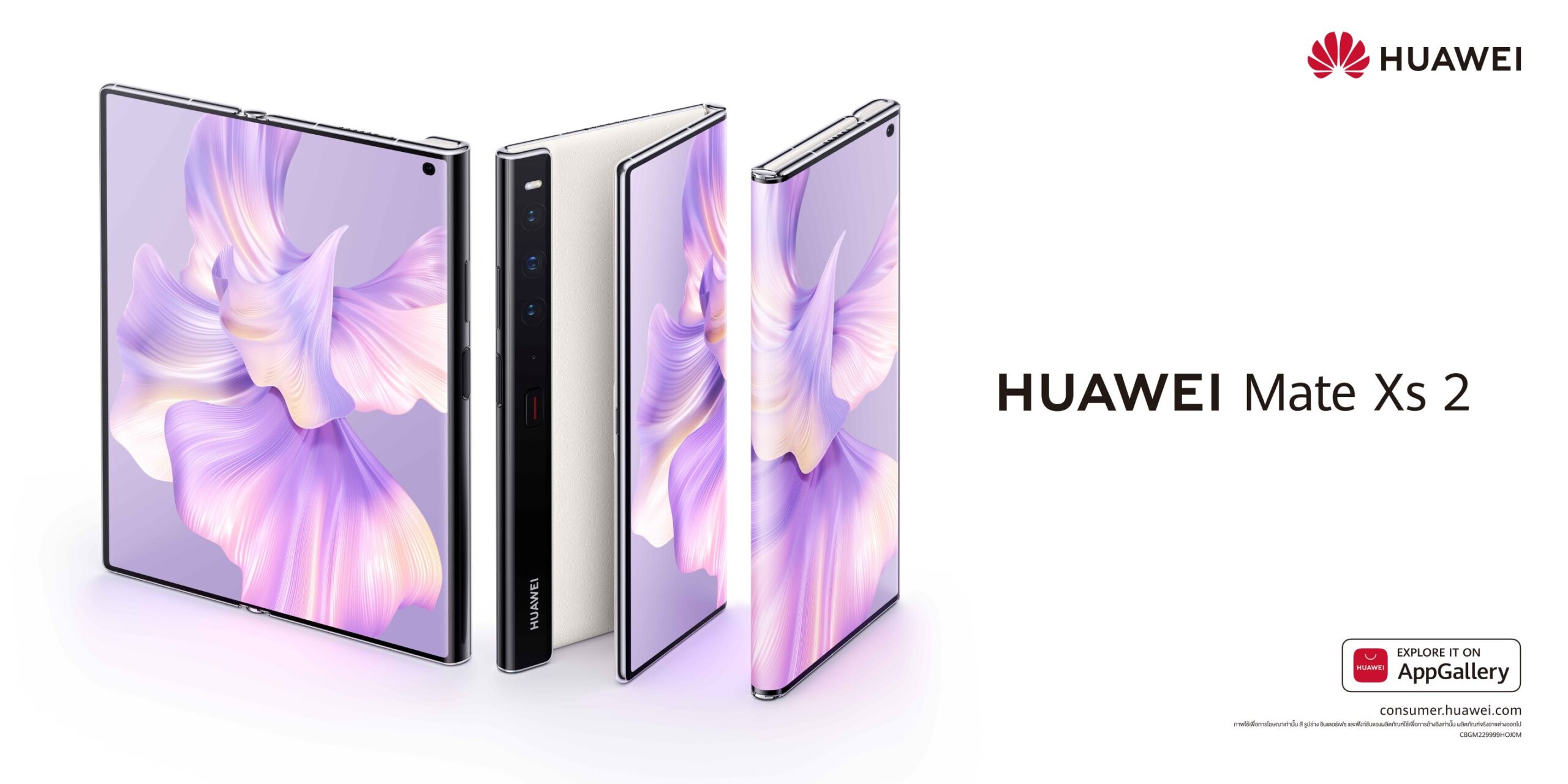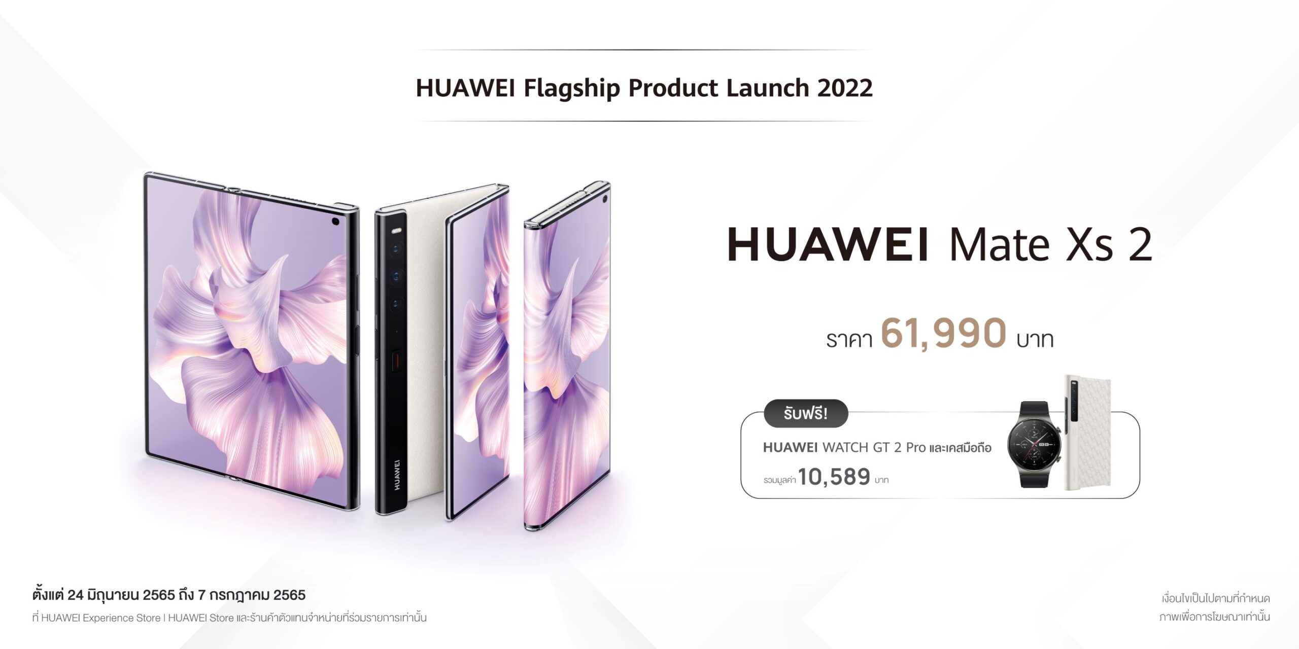 สานต่อนวัตกรรมสมาร์ทโฟนจอพับสุดคลาสสิกของหัวเว่ยกับ HUAWEI Mate Xs 2 สมาร์ทโฟนพับได้รุ่นเรือธงบางเบาและแบนราบเป็นพิเศษ ดีไซน์สุดหรูสะกดสายตากับครั้งแรกของการออกแบบพื้นผิวสัมผัสตัวเครื่องแบบ 3D Fiberglass ลดรอยนิ้วมือจากการใช้งาน เสริมแกร่งด้วยหน้าจอคอมโพสิตครั้งแรกของอุตสาหกรรม จากนวัตกรรมที่หัวเว่ยพัฒนาขึ้นเอง กันกระแทกได้ดี จอแสดงผลพับได้แบบ True-Chroma Display ขนาด 7.8 นิ้ว ระบบกล้อง True-Chroma กล้องหลังสามตัวความละเอียดสูงสุด50MP รองรับ HUAWEI XD Optics แบตเตอรี่ 4,880mAh รองรับ 66W HUAWEI SuperChargeชาร์จเต็ม 90% ในเวลาเพียง 30 นาที[2] เปิดราคาจำหน่ายในประเทศไทยที่ 61,990 บาท โดยสามารถพรีออเดอร์ได้ตั้งแต่ 24 มิถุนายน 2565 ถึง 7 กรกฎาคม 2565 พร้อมโปรโมชันสุดคุ้ม รับทันที! สมาร์ทวอทช์ HUAWEI WATCH GT 2 Pro มูลค่า 8,990 บาท และเคสใสสำหรับ HUAWEI Mate Xs 2 มูลค่า 1,599 บาท (รวมมูลค่า 10,589 บาท) โดยสามารถสั่งจองได้ที่หน้าร้าน HUAWEI Experience Store และร้านค้าที่ร่วมรายการ รวมถึงช่องทางออนไลน์อย่าง HUAWEI Store และร้านค้าอย่างเป็นทางการของหัวเว่ยบน Shopee, Lazada และแอปพลิเคชัน My HUAWEI พร้อมลงทะเบียนเพื่อรับข่าวสารก่อนใครได้ที่นี่ และศึกษาข้อมูลผลิตภัณฑ์เพิ่มเติมได้ที่นี่