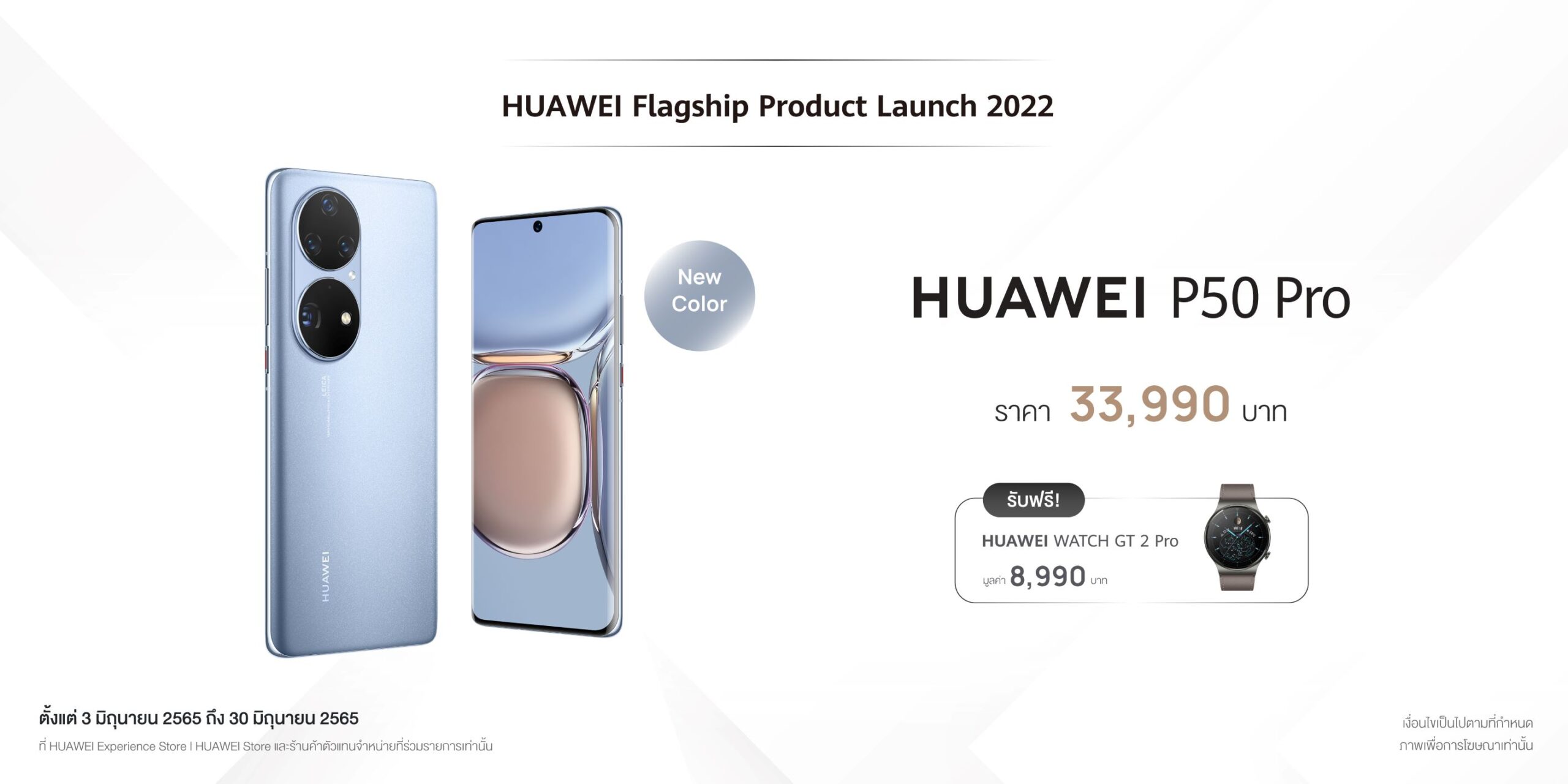 พร้อมกันนี้ หัวเว่ยยังได้เผยโฉมสุดเซอร์ไพรส์กับสีใหม่ล่าสุดของ HUAWEI P50 Pro สีฟ้า Silver Blue ซึ่งนำมาวางจำหน่ายอย่างเป็นทางการในประเทศไทยแล้วเช่นกัน วางจำหน่ายที่ 33,990 บาท รับฟรี! HUAWEI WATCH GT 2 Pro มูลค่า 8,990 บาท สำหรับลูกค้าที่สั่งซื้อตั้งแต่วันที่ 3 มิถุนายน 2565 ถึง 30 มิถุนายน 2565 ที่หน้าร้าน HUAWEI Experience Store และร้านค้าที่ร่วมรายการ รวมถึงช่องทางออนไลน์อย่าง HUAWEI Store และร้านค้าอย่างเป็นทางการของหัวเว่ยบน Shopee, Lazada และแอปพลิเคชัน My HUAWEI และศึกษาข้อมูลผลิตภัณฑ์เพิ่มเติมได้ที่นี่