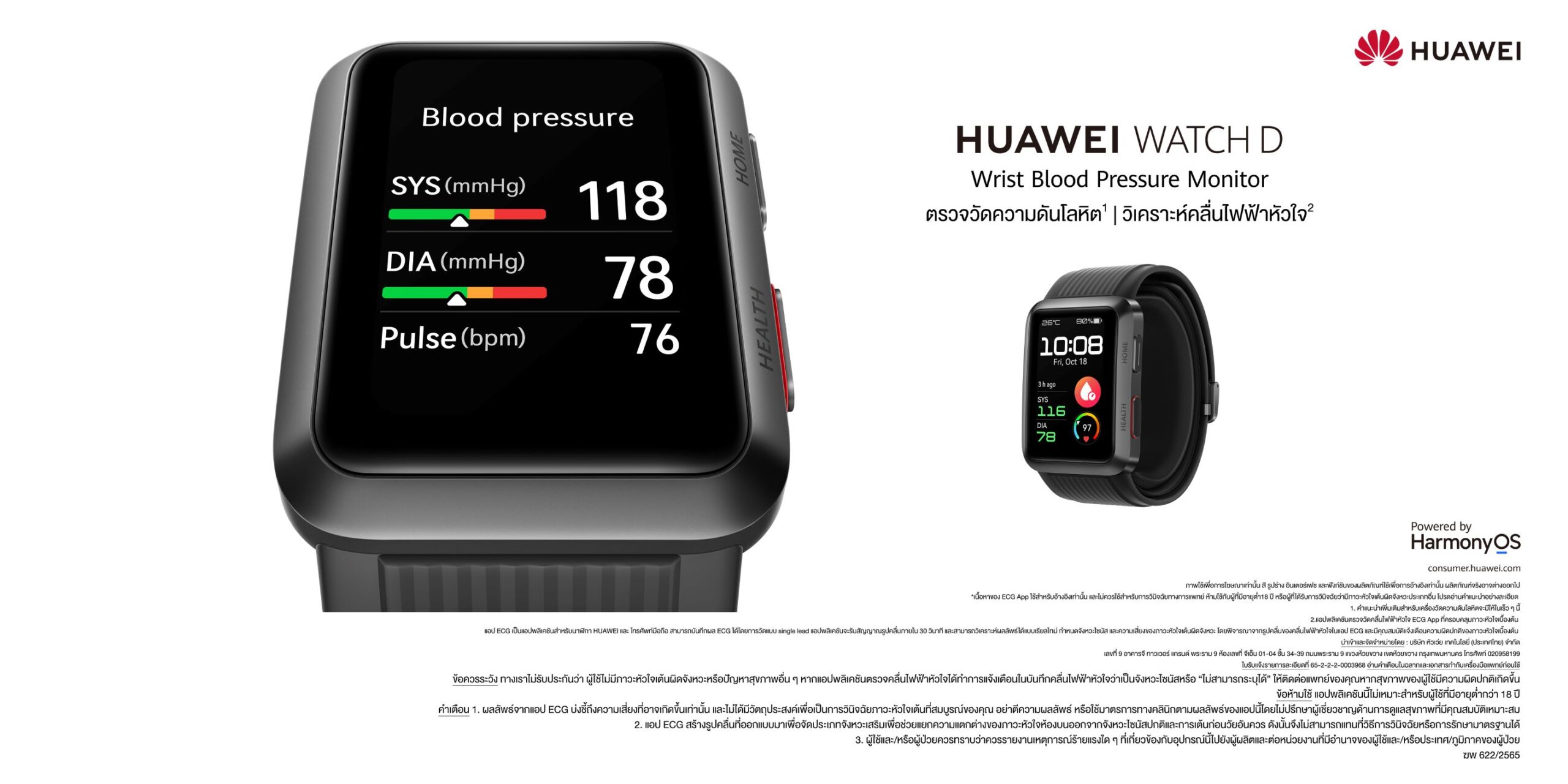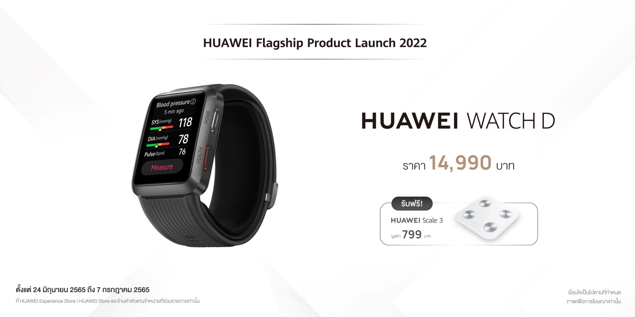 บุกเบิกอีกระดับของวงการสมาร์ทวอทช์ที่พลิกโฉมการตรวจวัดด้านสุขภาพ ไม่ว่าจะเป็นการตรวจวัดความดันโลหิต (BP Measurement) และการตรวจวัดคลื่นไฟฟ้าหัวใจด้วยแอปพลิเคชัน ECG[ii] เป็นแอปพลิเคชันสำหรับนาฬิกา HUAWEI และ โทรศัพท์มือถือ สามารถบันทึกผล ECG ได้โดยการวัดแบบsingle lead แอปพลิเคชันจะรับสัญญาณรูปคลื่นภายใน 30 วินาที และสามารถวิเคราะห์ผลลัพธ์ได้แบบเรียลไทม์ กำหนดจังหวะไซนัส และความเสี่ยงของภาวะหัวใจเต้นผิดจังหวะ โดยพิจารณาจากรูปคลื่นของคลื่นไฟฟ้าหัวใจในแอป ECG และมีคุณสมบัติแจ้งเตือนความผิดปกติของภาวะหัวใจเบื้องต้น ที่สามารถติดตามและตรวจสอบทุกที่ทุกเวลาผ่านสมาร์ทวอทช์เพียงเครื่องเดียว โดย HUAWEI WATCH D ยังมาพร้อมแบตเตอรี่สุดอึด ใช้งานต่อเนื่องได้นานสูงสุด 7 วัน[6] ดีไซน์เรียบง่ายเข้ากับทุกลุค สวมใส่สบายในทุกกิจกรรม มาในสีดำ ในราคา 14,990 บาท พิเศษ! รับทันที HUAWEI Scale 3 มูลค่า 799 บาท เมื่อสั่งซื้อสินค้าในช่วงพรีออเดอร์ ตั้งแต่ 24 มิถุนายน 2565 ถึง 7 กรกฎาคม 2565 หน้าร้าน HUAWEI Experience Store และร้านค้าที่ร่วมรายการ รวมถึงช่องทางออนไลน์อย่าง HUAWEI Store และร้านค้าอย่างเป็นทางการของหัวเว่ยบน Shopee, Lazada และแอปพลิเคชัน My HUAWEI และศึกษาข้อมูลผลิตภัณฑ์เพิ่มเติมได้ที่นี่