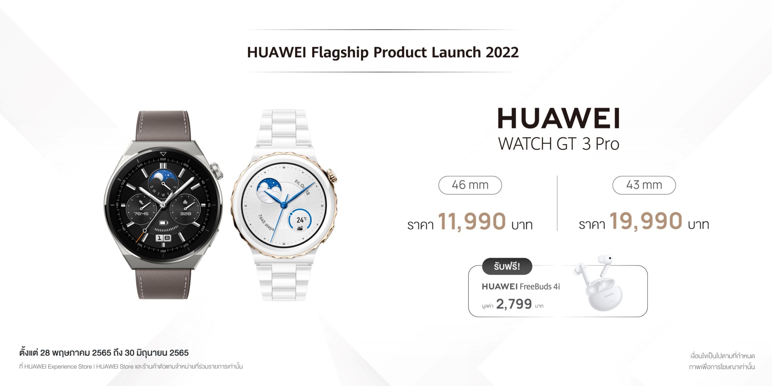 รองรับการดำน้ำลึก 30 เมตรทั้งในน้ำทะเล[3] และน้ำจืด มีฟีเจอร์สุดอัจฉริยะคอยคำนวนระยะเวลาที่ควรขึ้นสู่ผิวน้ำ พร้อมบอกระดับความลึกได้แบบเรียลไทม์ มีโหมดฝึกกลั้นลมหายใจ (Apnea Training) ให้ฝึกซ้อมก่อนลงดำน้ำจริง สามารถกันน้ำที่ระดับมาตรฐาน 5ATM (ความลึกประมาณ 50 เมตร) ส่วนโหมดกอล์ฟก็สามารถติดตามรายละเอียดของวงสวิงได้เป็นอย่างดี และยังมี AI Running Coach กําหนดแผนการวิ่งอย่างมีประสิทธิภาพ พร้อมโหมดออกกำลังกายกว่า 100 โหมด รองรับการใช้งานต่อเนื่องนานสูงสุด 14 วัน[4] และยังคอยดูแลสุขภาพแบบอัจฉริยะได้ด้วยแอปพลิเคชัน ECG[i] เป็นแอปพลิเคชันสำหรับนาฬิกา HUAWEI และ โทรศัพท์มือถือ สามารถบันทึกผล ECG ได้โดยการวัดแบบ single lead แอปพลิเคชันจะรับสัญญาณรูปคลื่นภายใน 30 วินาที และสามารถวิเคราะห์ผลลัพธ์ได้แบบเรียลไทม์ กำหนดจังหวะไซนัส และความเสี่ยงของภาวะหัวใจเต้นผิดจังหวะ โดยพิจารณาจากรูปคลื่นของคลื่นไฟฟ้าหัวใจในแอป ECG และมีคุณสมบัติแจ้งเตือนความผิดปกติของภาวะหัวใจเบื้องต้น และยังมาพร้อมกับการวัดค่าความอิ่มตัวของออกซิเจนในเลือด (SpO2)[5] และการสอดส่องการใช้ชีวิตประจำวันให้มีคุณภาพด้วยฟีเจอร์การแจ้งเตือนกิจวัตรต่างๆ กับ HUAWEI Healthy Living Shamrock โดยHUAWEI WATCH GT 3 Pro ขนาด 46 มม. มาในชื่อรุ่น Titanium Edition ดีไซน์เข้มสุดแกร่งด้วยกรอบไทเทเนียม สายหนัง วางจำหน่ายในราคา 11,990 บาท ส่วนขนาด 43 มม. มาในชื่อรุ่น Ceramic Edition หรูหราด้วยเซรามิกสีขาวขอบสีทอง พร้อมสายเซรามิกสีขาว วางจำหน่ายในราคา 19,990 บาท ทั้งสองรุ่นรับฟรีหูฟังไร้สาย HUAWEI FreeBuds 4i มูลค่า 2,799 บาท เมื่อสั่งซื้อสินค้าก่อนใคร ระหว่างวันที่ 28 พฤษภาคม 2565 ถึง 30 มิถุนายน 2565 ที่หน้าร้าน HUAWEI Experience Store และร้านค้าที่ร่วมรายการ รวมถึงช่องทางออนไลน์อย่าง HUAWEI Store และร้านค้าอย่างเป็นทางการของหัวเว่ยบน Shopee, Lazada, JD Central และ Thisshop และแอปพลิเคชัน My HUAWEI พร้อมศึกษาข้อมูลผลิตภัณฑ์เพิ่มเติมได้ที่นี่