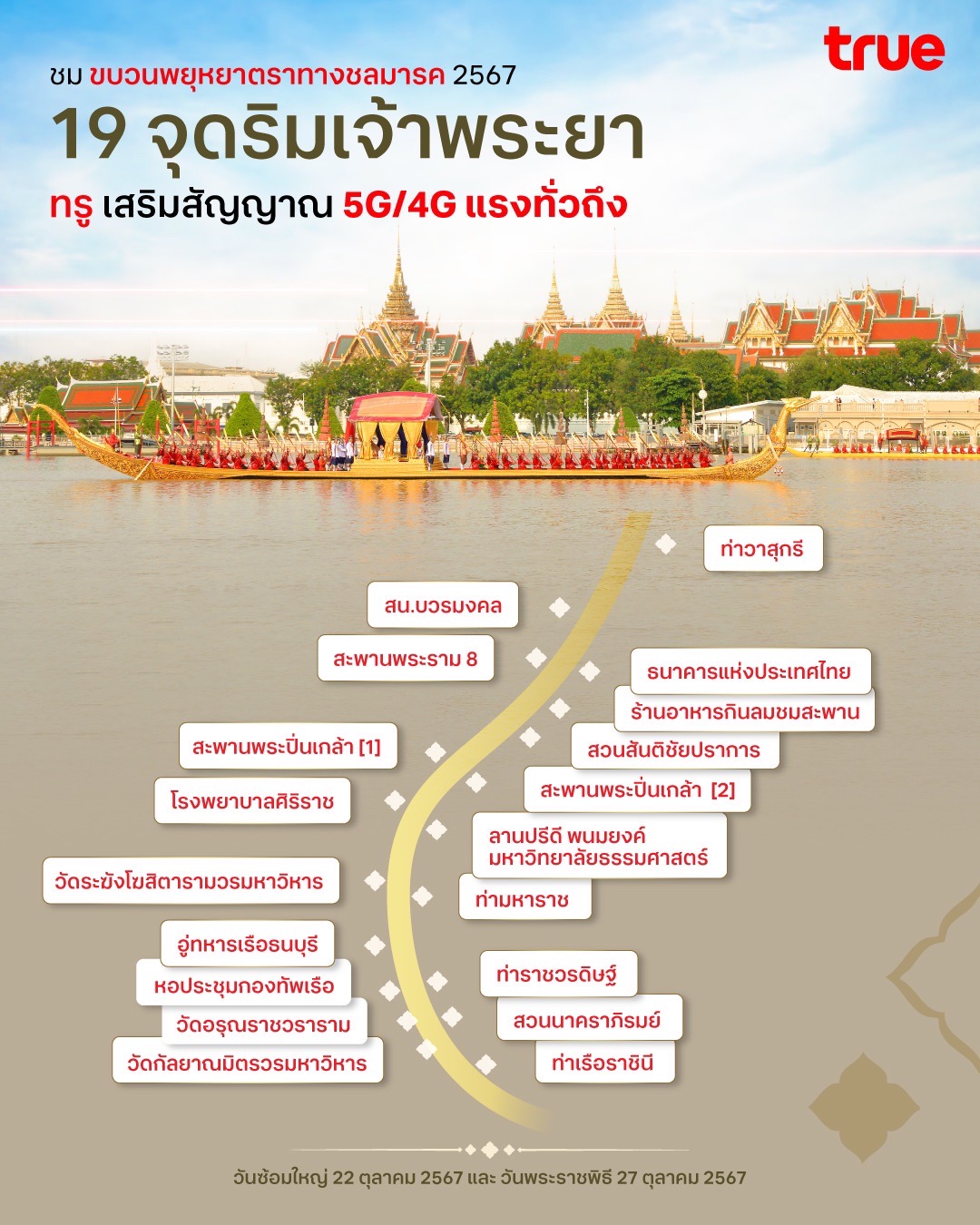ทรู คอร์ปอเรชั่น จัดโซลูชันเพิ่มสัญญาณเครือข่าย 5G, 4G, WiFi พร้อมรองรับการใช้งานในพื้นที่ต่างๆ ที่ประชาชนจะร่วมรับชมขบวนพยุหยาตราทางชลมารค ตามเส้นทางริมแม่น้ำเจ้าพระยาตั้งแต่สะพานพระราม 8 จนถึงวัดอรุณราชวราราม โดยขยายเครือข่ายการสื่อสารเป็นที่เรียบร้อย พร้อมนำทีมลงพื้นที่ตรวจสอบสัญญาณให้มั่นใจ พร้อมรองรับการใช้งานทั้งในวันซ้อมใหญ่เสมือนจริงซึ่งจะจัดขึ้นอีก 1 ครั้ง ในวันที่ 22 ตุลาคม 2567 และในวันพระราชพิธีจริง คือ วันที่ 27 ตุลาคม 2567 นี้