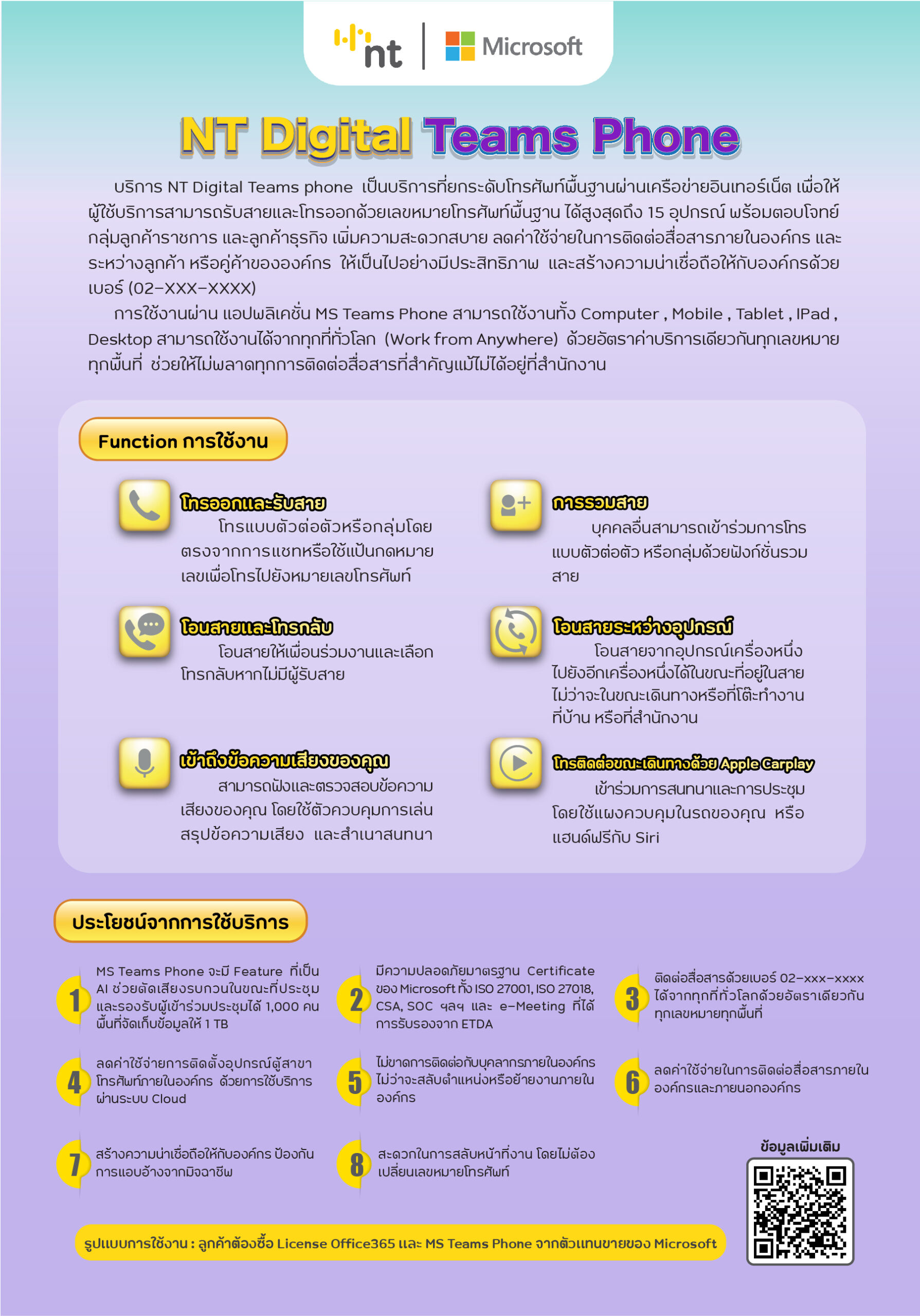 นายเสกสรรค์ มิตรเกษม รองกรรมการผู้จัดการใหญ่สายงานการตลาดและผลิตภัณฑ์ เปิดเผยว่า NT Digital Teams Phone เป็นการพัฒนาและต่อยอดบริการโทรศัพท์ประจำที่ให้ก้าวไปสู่ยุคดิจิทัลผ่าน แอปพลิเคชัน Microsoft Teams ด้วยการเสริมประสิทธิภาพการใช้ Voice ผ่านโทรศัพท์ประจำที่ที่มีอยู่ในการใช้งานมากยิ่งขึ้น สามารถตอบสนองลูกค้าในการสื่อสารออนไลน์ การส่งข้อมูลออนไลน์ การประชุม ออนไลน์ได้ แม้แต่การติดต่อกันผ่านโทรศัพท์ ได้โดยไม่มีค่าใช้จ่ายเพิ่มขึ้น บริการนี้จะช่วยให้การติดต่องาน หรือการประชุมสะดวกราบรื่นตลอดเวลา โดยไม่ต้องแจ้งเลขหมายใหม่หรือ ใช้เลขหมายมือถือส่วนตัว ในการติดต่อ ทำให้ธุรกิจต่างๆ สามารถควบคุมภาระค่าใช้จ่ายในการดูแลระบบโทรคมนาคม ภายใน องค์กรได้เป็น อย่างดี การใช้งานผ่านแอปพลิเคชัน MS Teams Phone ทำให้สามารถใช้งานได้ทั้ง Computer, Mobile, Tablet, Ipad, Desktop จากทุกที่ทั่วโลก ด้วยอัตราค่าบริการเดียวกันทุกเลขหมายทุกพื้นที่ ช่วยให้ไม่พลาดทุกการติดต่อสื่อสารที่สำคัญแม้ไม่ได้อยู่ที่สำนักงาน กลุ่มลูกค้าจะเป็นกลุ่มลูกค้าธุรกิจ SMEs Corporate , ราชการ และรัฐวิสาหกิจ สนใจสมัครวันนี้ ถึง 30 กันยายน 2568 ค่าบริการรายเดือน 120 บาท ต่อเลขหมายต่อเดือน ไม่รวม ค่าMicrosoft License