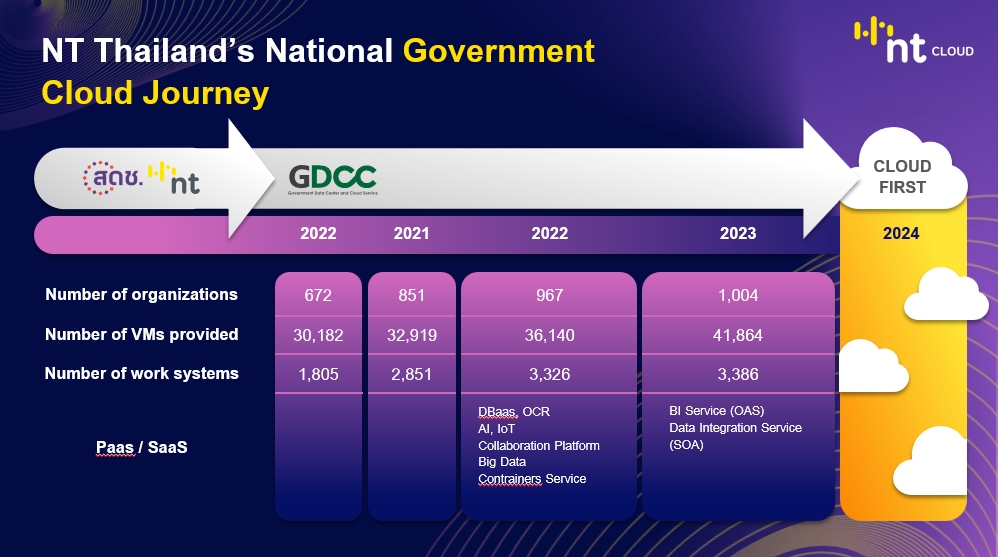 พันเอก สรรพชัยย์ หุวะนันทน์ กรรมการผู้จัดการใหญ่ บริษัท โทรคมนาคมจำกัด (มหาชน) หรือ NT ในฐานะผู้ให้บริการคลาวด์ภาครัฐรายใหญ่รวมถึงระบบคลาวด์กลางภาครัฐ GDCC กล่าวในงาน Public Sector Day Thailand 2024 ซึ่งจัดโดย AWS (Amazon Web Services) เกี่ยวกับภาพรวมการยกระดับศักยภาพคลาวด์กลางภาครัฐของประเทศไทยว่า นอกจาก NTเปิดให้บริการระบบคลาวด์กลาง GDCC มาแล้วกว่า 5 ปีโดยช่วยลดค่าใช้จ่ายภาครัฐในการใช้งานและบำรุงรักษาไม่น้อยกว่า 40% รวมถึงการตอบโจทย์ด้านความมั่นคงปลอดภัยของข้อมูลที่ต้องจัดเก็บภายในประเทศ ล่าสุดเพื่อขับเคลื่อนการเปลี่ยนผ่านสู่ยุคดิจิทัลของประเทศด้วยเทคโนโลยีบนคลาวด์เต็มประสิทธิภาพ NT ได้เตรียมขยายการรองรับหน่วยงานภาครัฐโอนย้ายระบบงานขึ้นคลาวด์ในระยะต่อไปด้วยคลาวด์ที่ทันสมัยยิ่งขึ้นภายใต้นโยบาย Go Cloud First ของกระทรวงดิจิทัลเพื่อเศรษฐกิจและสังคม ที่มุ่งนำระบบงานรัฐขึ้นคลาวด์ทั้งหมดในปีหน้า