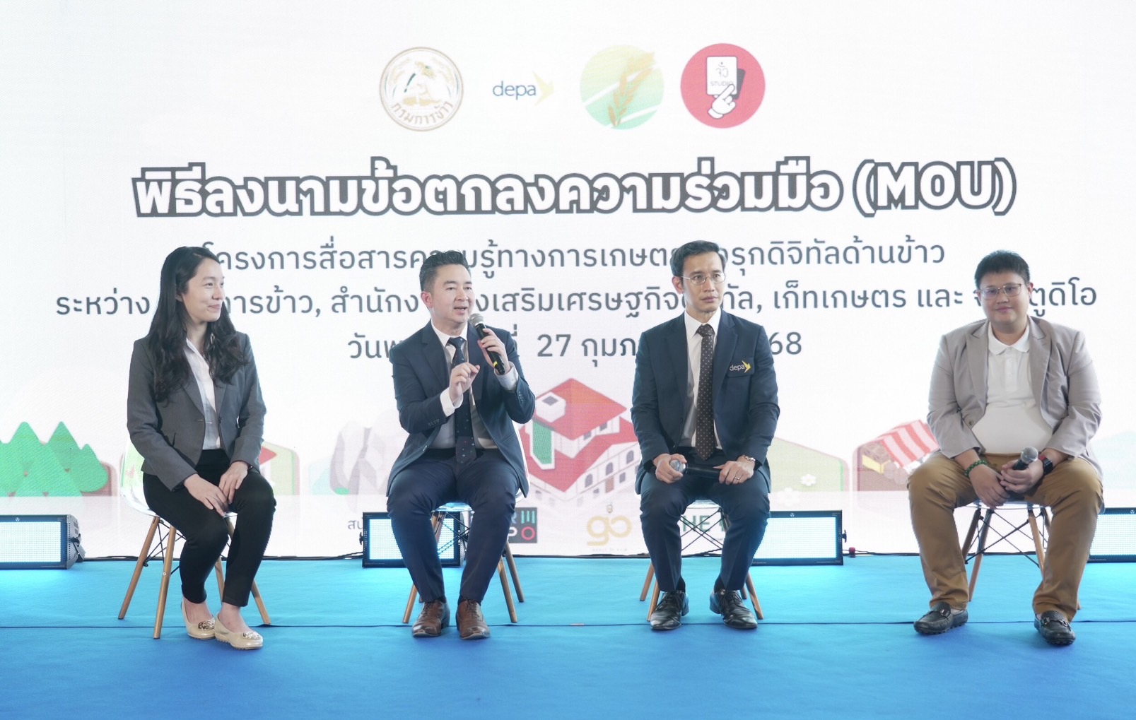 ดร.รัฐศาสตร์ กรสูต รองผู้อำนวยการใหญ่ สำนักงานส่งเสริมเศรษฐกิจดิจิทัล หรือ ดีป้า พร้อมด้วย นายอานนท์ นนทรีย์ รองอธิบดีกรมการข้าว กระทรวงเกษตรและสหกรณ์ นางสาวธันยธร จรรยาวรลักษณ์ ประธานกรรมการ บริษัท เก็ทเกษตร จำกัด และ นายอัคคภพ จันทรศรีวงศ์ กรรมการ บริษัท จั่วได้จั่วดี จำกัด (จั่วสตูดิโอ) ร่วมลงนามในบันทึกข้อตกลงความร่วมมือการสื่อสารความรู้ทางการเกษตรเชิงรุกทางดิจิทัลด้านข้าว โดยมีผู้บริหารจากทั้ง 4 หน่วยงานร่วมเป็นสักขีพยาน ณ อาคารดีป้า (สำนักงานใหญ่)