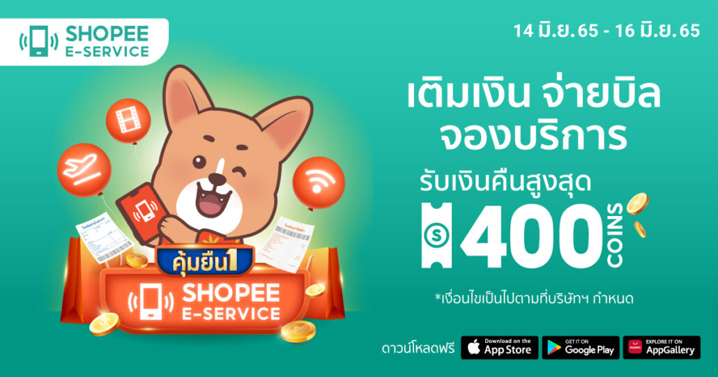 ยิ่งจ่ายเยอะยิ่งคุ้มกว่า เมื่อจ่ายผ่าน ShopeePay บนช้อปปี้ อีเซอร์วิส ระหว่างวันที่ 14 – 16 มิถุนายน 2565 เท่านั้น พบกับดีลพิเศษอย่างจ่ายบิลฟินรับกลางเดือน รับเงินคืน 10% สูงสุด 100 ช้อปปี้ คอยน์, ดีลป๊อปคอร์น ตั๋วหนัง คุ้มสุดๆ เริ่มต้นเพียง 9 บาท, ดีลเที่ยวสุดคุ้ม จองโรงแรม จองตั๋วเครื่องบิน รับเงินคืนสูงสุด 400  ช้อปปี้ คอยน์ และเติมเงินบัตร MRT คุ้มสุดปัง รับเงินคืนถึง 10% ช้อปปี้ คอยน์