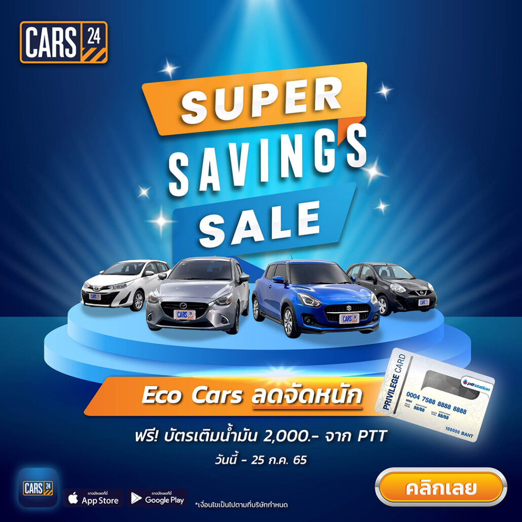 CARS24 (คาร์สทเวนตี้โฟร์) ศูนย์รวมรถมือสองออนไลน์ ที่เดียว ที่ซื้อ ขาย เทิร์น ครบจบที่เดียว และเป็นแพลตฟอร์มรถมือสองที่เติบโตเร็วที่สุดในเอเชีย เดินหน้ากระตุ้นเศรษฐกิจ ส่งมอบแคมเปญพิเศษ Super Saving Sales ECO Cars ด้วยโปรโมชันซื้อรถยนต์ ECO Cars รุ่นยอดนิยม พร้อมส่วนลดสูงสุด 23,500 บาท และรับฟรีบัตรเติมน้ำมันจาก ปตท. มูลค่า 2,000 บาท เพื่อแบ่งเบาภาระให้ผู้บริโภคซื้อรถยนต์ในราคาที่ดีที่สุด และได้รับประโยชน์สูงสุดในยุคน้ำมันแพง ตั้งแต่วันนี้ – 25 กรกฎาคม 2565 เท่านั้น!