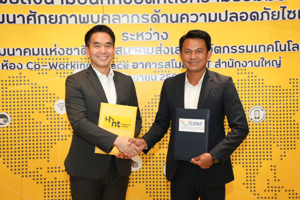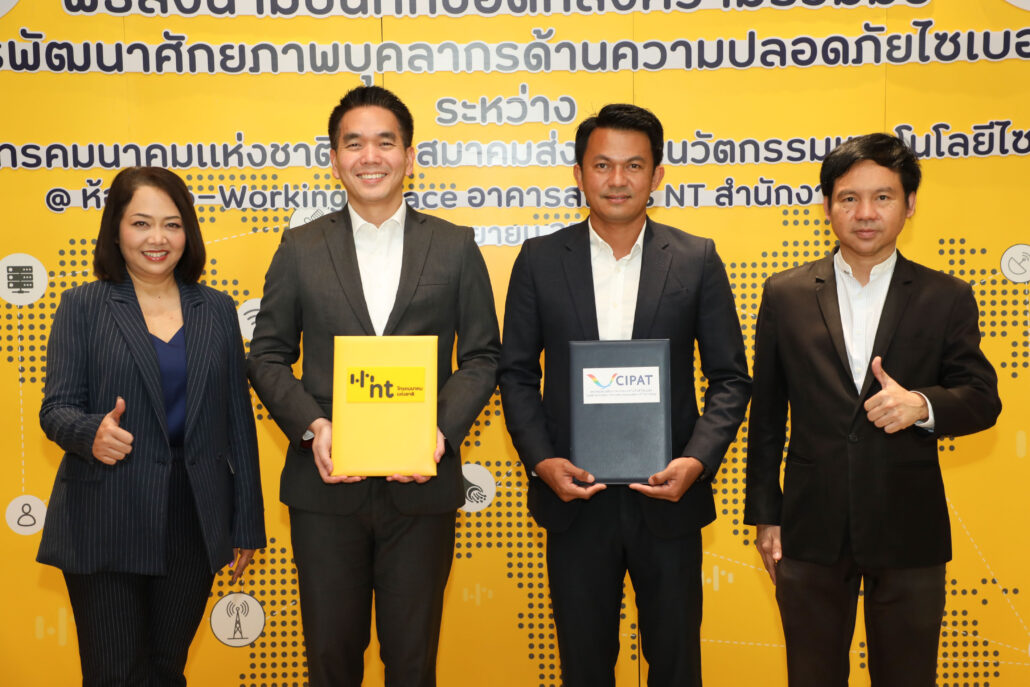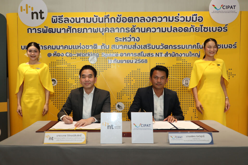 นายวงกต วิจักขณ์สังสิทธิ์ รองกรรมการผู้จัดการใหญ่สายงานดิจิทัลและโซลูชั่น บริษัท โทรคมนาคมแห่งชาติ จำกัด (มหาชน) หรือ NT และ นายอดิศร นิลวิสุทธิ์ นายกสมาคมส่งเสริมนวัตกรรมเทคโนโลยีไซเบอร์ หรือ CIPAT ร่วมลงนามความร่วมมือในการพัฒนาศักยภาพบุคลากรและหลักสูตรฝึกอบรมสำหรับผู้เชี่ยวชาญด้านไซเบอร์ (Cyber Expert) ที่ห้อง Co-Working Space NT สำนักงานใหญ่