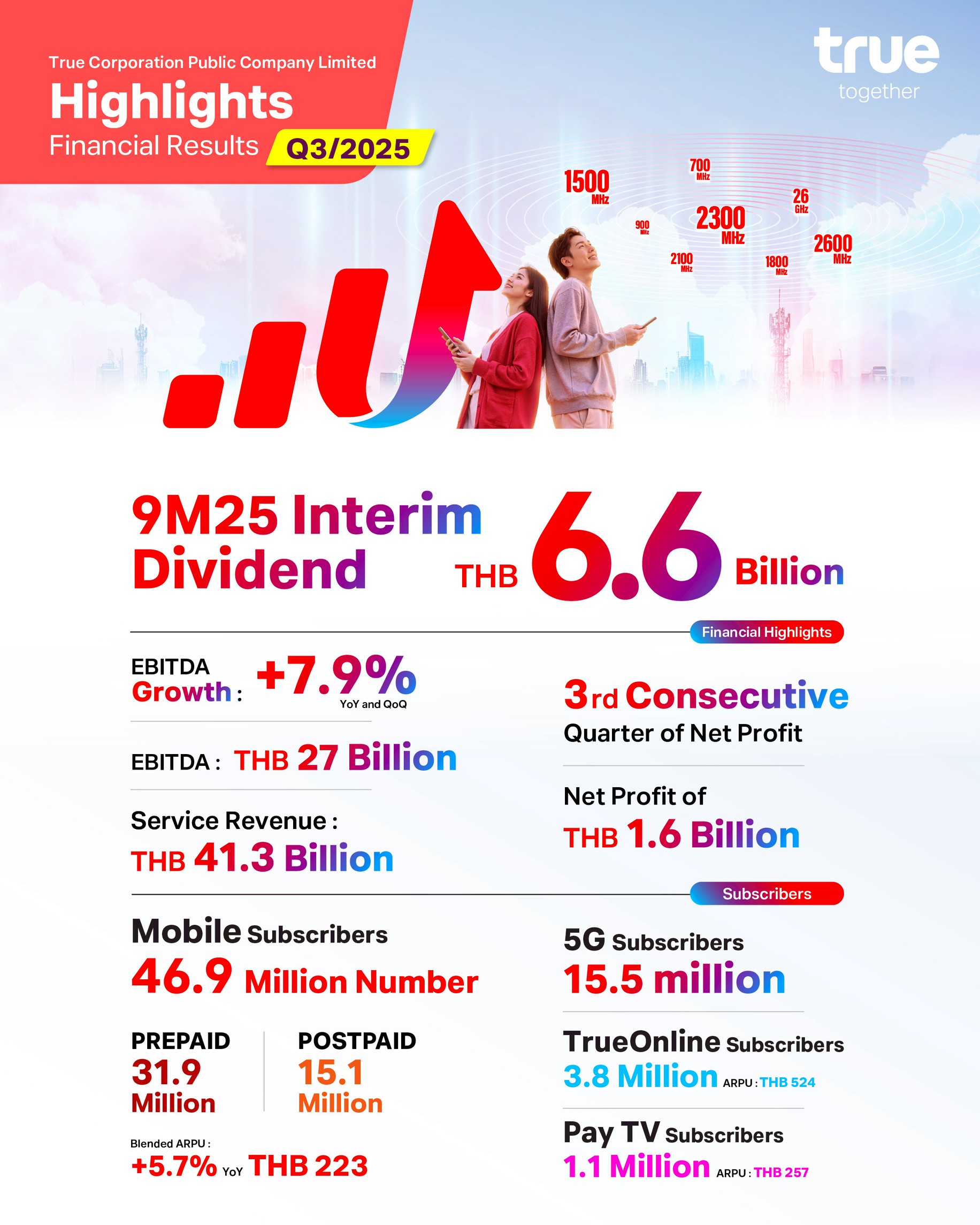 บริษัท ทรู คอร์ปอเรชั่น จำกัด (มหาชน) รายงานผลกำไรหลังหักภาษีประจำไตรมาส 3/2568 มูลค่า 1.6 พันล้านบาท ซึ่งนับเป็นการทำกำไร 3 ไตรมาสติดต่อกัน หากไม่รวมผลกระทบจากรายการที่เกิดขึ้นครั้งเดียว บริษัทฯ มีกำไรสุทธิหลังหักภาษีและหลังปรับปรุงรายการพิเศษ (Normalized Net Profit) อยู่ที่ 4.6 พันล้านบาท ในส่วน EBITDA อยู่ที่ 2.7 หมื่นล้านบาท โดยได้แรงหนุนหลักจากการได้มาซึ่งใบอนุญาตให้ใช้คลื่นความถี่ สำหรับการดำเนินงาน 9 เดือนแรกของปี 2568 บริษัทฯ ได้ประกาศจ่ายเงินปันผลระหว่างกาล จำนวน 6.6 พันล้านบาท คิดเป็นอัตราการจ่ายเงินปันผล 125%