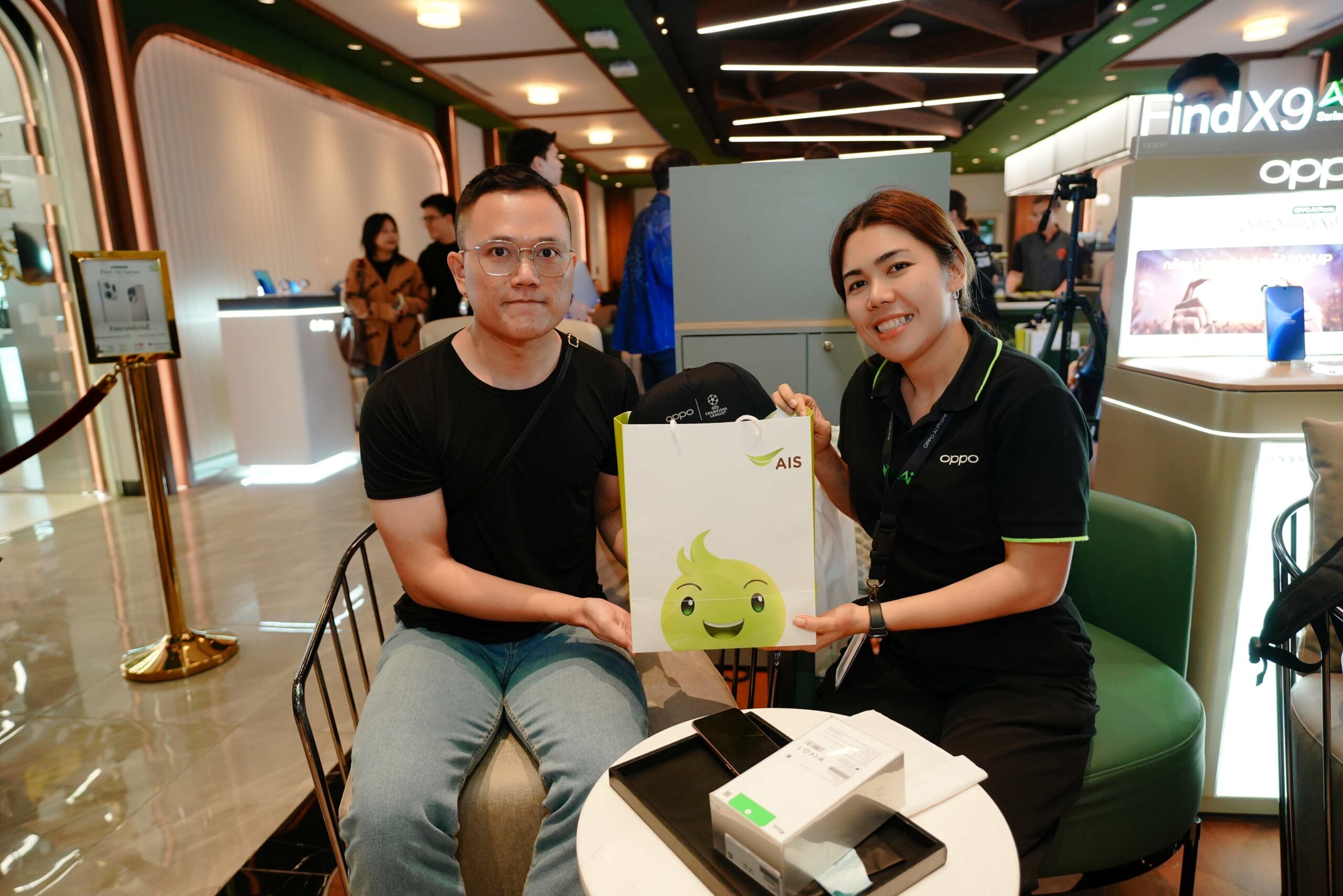 AIS นำโดย นายประพัฒน์ เสียงจันทร์ หัวหน้าคณะผู้บริหารด้านธุรกิจค้าปลีก ผนึกกำลัง OPPO นำโดย นายชานนท์ จิรายุกุล ประธานกรรมการอาวุโสฝ่ายบริหาร แบรนด์สมาร์ทโฟนระดับโลก เดินหน้ามอบประสบการณ์เหนือระดับให้ลูกค้า AIS ที่จองเครื่อง “OPPO Find X9 Series” ล่วงหน้า ได้สัมผัสสมาร์ทโฟนเรือธงรุ่นใหม่ล่าสุดจาก OPPO เป็นกลุ่มแรกก่อนใคร! พร้อมมอบโปรโมชันสุดพิเศษให้ลูกค้า AIS เมื่อซื้อ OPPO Find X9 Series สมาร์ทโฟนที่มาพร้อมพลังซูมระดับเทพ “ซูมดีทุกคอนเสิร์ต” รุ่นล่าสุด อาทิ รับส่วนลดสูงสุด 6,900 บาทเมื่อซื้อเครื่องพร้อมแพ็กเกจ, นำเครื่องเก่าแลกใหม่ รับส่วนลดเพิ่มสุดคุ้ม สูงสุด 10,000 บาท, ใช้เอไอเอสพอยท์ 10 คะแนน แลกรับส่วนลดซื้อเครื่องเปล่าไม่ติดสัญญาสูงสุด 3,000 บาท, รับสิทธิพิเศษชมความบันเทิงผ่าน AIS PLAY ที่รวมที่สุดแห่งความบันเทิงและกีฬา ดูพรีเมียร์ลีกสด ครบทุกแมตช์ นาน 3 เดือน, รับสิทธิ์ชมคอนเทนต์แบบไม่มีโฆษณาคั่น YouTube Premium ฟรี! 2 เดือน, รับสิทธิ์ฟังเพลงที่ชอบผ่าน Spotify Premium แบบไม่มีสะดุด นาน 4 เดือน, AIS Care+ ฟรี! 1 เดือน แพ็กเกจดูแลเครื่องทุกกรณี, เมื่อซื้อสินค้าผ่าน AIS Shop ผ่อน 0% นานสูงสุด 36 เดือน หรือรับเครดิตเงินคืน และ เมื่อซื้อสินค้าผ่าน AIS Online Store ผ่อน 0% นานสูงสุด 24 เดือน นอกจากนี้ยังได้รับของแถมแบบจัดเต็ม