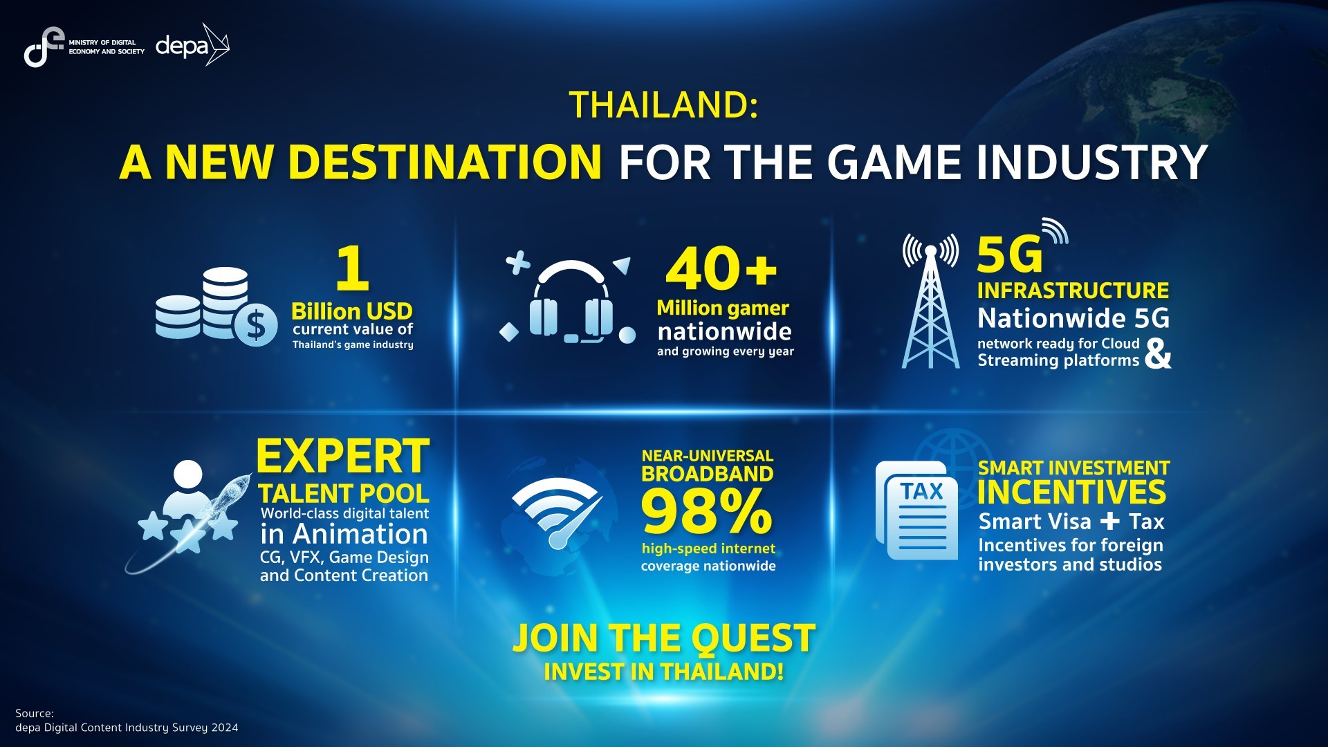 ผู้อำนวยการใหญ่ ดีป้า กล่าวเพิ่มเติมว่า ด้วยองค์ประกอบที่ครบถ้วน ทั้งตลาดผู้บริโภคขนาดใหญ่และเติบโตอย่างต่อเนื่อง แรงงานคุณภาพสูง โครงสร้างพื้นฐานดิจิทัลที่ทันสมัย และนโยบายสนับสนุนจากภาครัฐ ประเทศไทยจึงมีความพร้อมอย่างเต็มที่ในการก้าวสู่การเป็น Game Industry Destination หรือจุดหมายสำคัญของอุตสาหกรรมเกมของภูมิภาค และเป็นศูนย์กลางการลงทุนด้านเกมของเอเชียตะวันออกเฉียงใต้ ที่ไม่เพียงดึงดูดนักลงทุน แต่ยังสร้างโอกาสให้ผู้ประกอบการไทยขยายตลาดสู่เวทีโลก พร้อมขับเคลื่อนเศรษฐกิจดิจิทัลของประเทศไปสู่ความยั่งยืนในระยะยาว