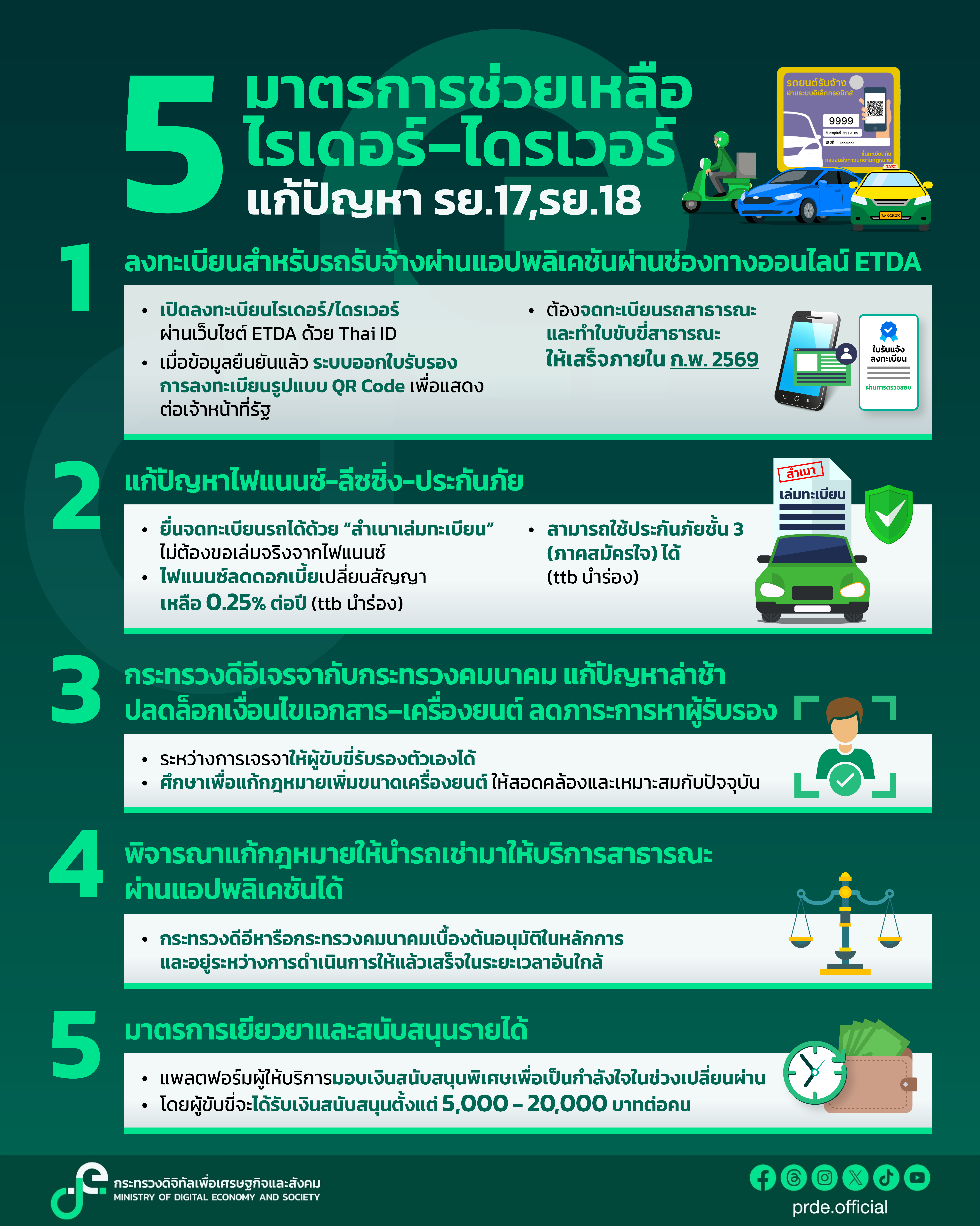 กระทรวงดิจิทัลเพื่อเศรษฐกิจและสังคม (MDES) แถลงความคืบหน้ามาตรการเร่งด่วนเพื่อบรรเทาผลกระทบให้แก่กลุ่มผู้ขับขี่รถรับจ้างผ่านแอปพลิเคชัน ภายหลังได้รับหนังสือร้องเรียนเมื่อวันที่ 11 พฤศจิกายนที่ผ่านมา โดยนายไชยชนก ชิดชอบ รัฐมนตรีว่าการกระทรวงดิจิทัลเพื่อเศรษฐกิจและสังคม พร้อมด้วยนางสาวมัลลิกา จิระพันธุ์วาณิช รัฐมนตรีช่วยว่าการกระทรวงคมนาคม ได้เร่งประสานทุกหน่วยงานที่เกี่ยวข้องเพื่อปลดล็อกข้อจำกัดทางกฎหมายและลดภาระค่าใช้จ่าย ภายใต้นโยบาย Quick Big Win ของนายอนุทิน ชาญวีรกุล นายกรัฐมนตรี ซึ่งใช้เวลาเพียง 7 วัน ในการหาข้อยุติและออกเป็น 5 มาตรการสำคัญในการช่วยเหลือไรเดอร์และไดรเวอร์ทั่วประเทศ โดยกำหนดกรอบระยะเวลาตั้งแต่วันที่ 17 พ.ย. 2568-28 ก.พ. 2569