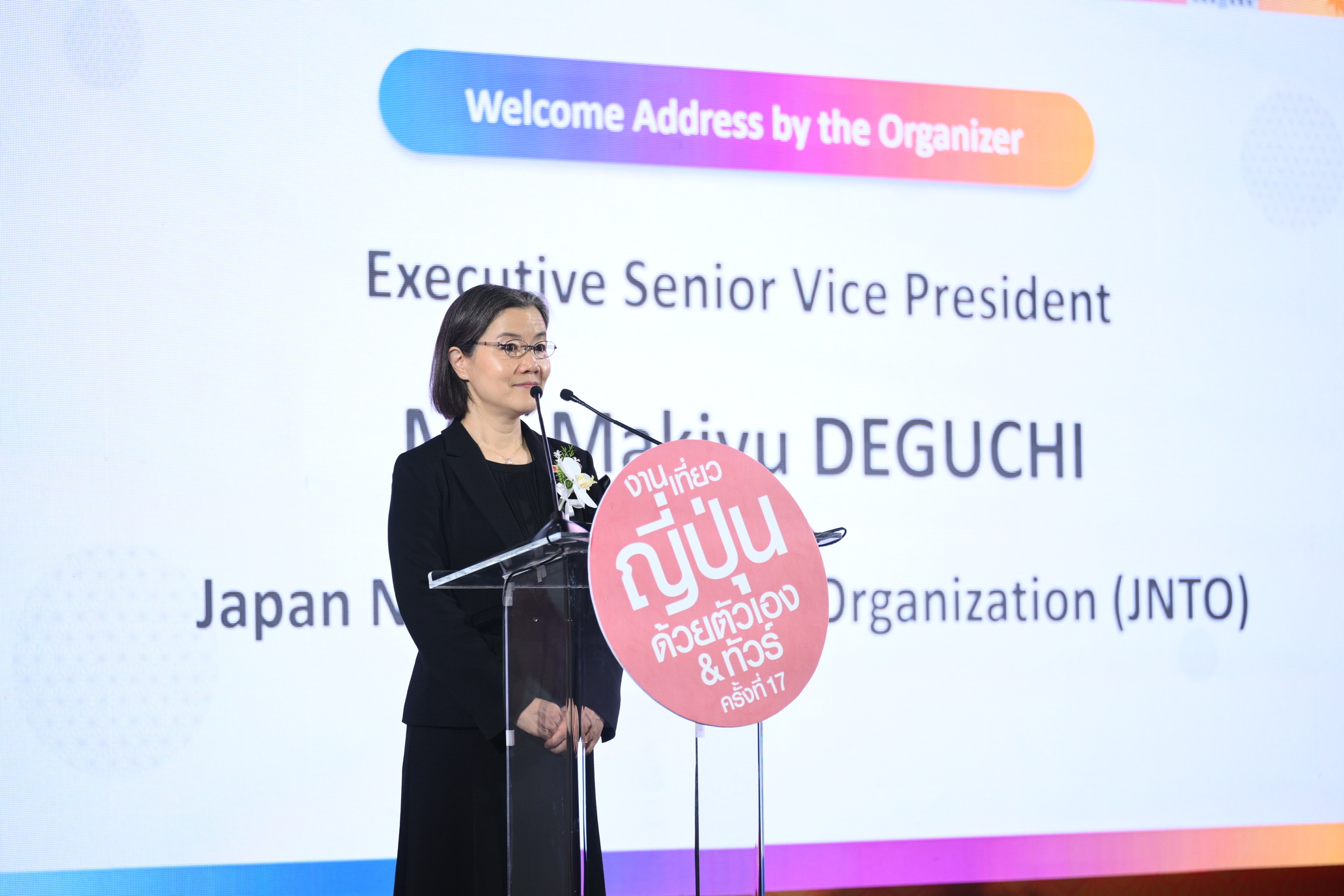 นางเดงุจิ มาคิยู รองประธานกรรมการบริหารอาวุโส องค์การส่งเสริมการท่องเที่ยวแห่งประเทศญี่ปุ่น (JNTO) ได้กล่าวเปิดงานว่า “ขอขอบคุณพันธมิตรจากทั้งประเทศไทยและญี่ปุ่นที่ได้ร่วมแรงร่วมใจกันอย่างยาวนาน ส่งผลให้นักท่องเที่ยวชาวไทยจำนวนมากได้เดินทางไปเยือนประเทศญี่ปุ่น เราหวังว่างานนี้จะทำให้ท่านได้ค้นพบ ‘ญี่ปุ่นมุมใหม่’ ของภูมิภาคต่างๆ และขอเชิญชวนให้ทุกท่านเดินทางไปเยือนญี่ปุ่น”