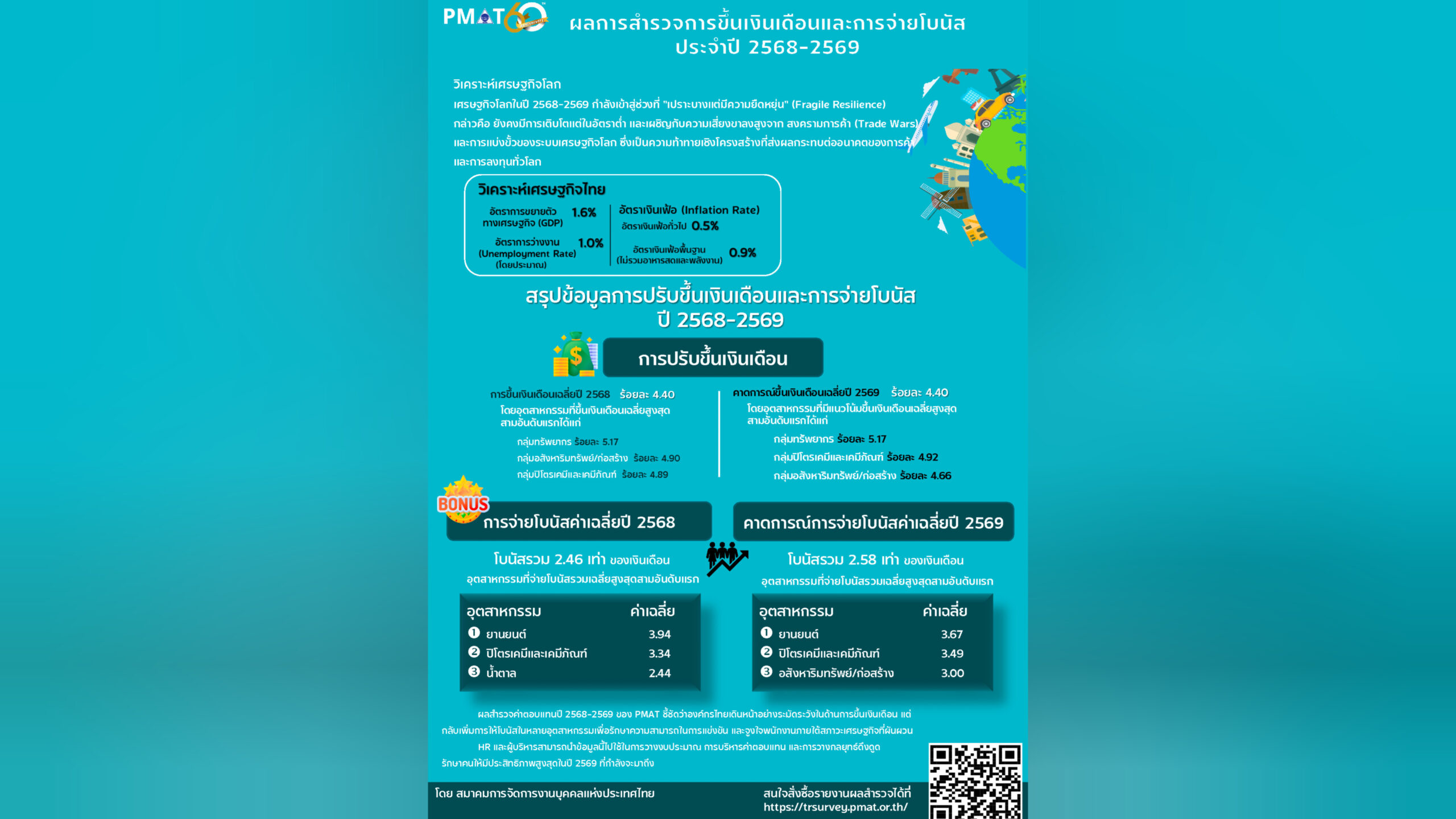 PMAT เผยผลสำรวจค่าตอบแทนปี 2568–2569: องค์กรไทยPMAT เผยผลสำรวจค่าตอบแทนปี 2568–2569 ชี้การปรับเงินเดือนเฉลี่ยทรงตัวที่ 4.40% ท่ามกลางสภาวะเศรษฐกิจโลกและไทยที่ชะลอตัว แต่โบนัสมีแนวโน้มเพิ่มขึ้นเล็กน้อย