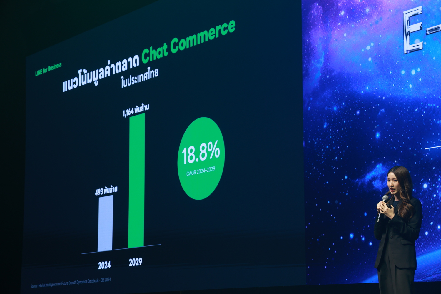 คุณบัณยดา อินทาปัจ ผู้ช่วยผู้จัดการทีม Business Development จาก LINE ประเทศไทย กล่าวว่า “การแชทถือเป็นหัวใจสำคัญของตลาด Commerce ไทย เนื่องจากผู้บริโภคมีพฤติกรรมชอบพูดคุยสอบถามก่อนการซื้อ-ขาย เห็นได้จากมูลค่าตลาด Chat Commerce ที่คาดว่าจะเพิ่มจาก 493 พันล้านบาทในปี 2024 สู่ 1.16 ล้านล้านบาทในปี 2029 หรือมีการเติบโตเฉลี่ย 18.8% ต่อปี พร้อมทั้งยังพบว่า 81% ของผู้บริโภคเลือกทักไปพูดคุยสอบถามร้านค้าในช่องทาง Official อย่างน้อยสัปดาห์ละครั้ง”