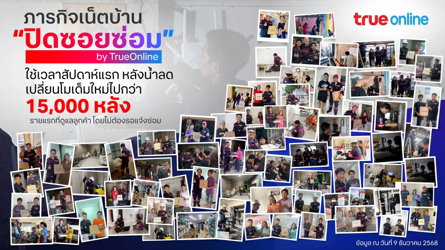 ทรูออนไลน์เร่งฟื้นฟูโครงข่ายหาดใหญ่ต่อเนื่อง หลังน้ำลดสัปดาห์แรก ดูแลลูกค้าเปลี่ยนโมเด็มใหม่ไปกว่า 15,000 หลัง รายแรกที่ลงพื้นที่รุกภารกิจ “ปิดซอยซ่อม” ทันทีโดยไม่ต้องรอให้ลูกค้าแจ้ง