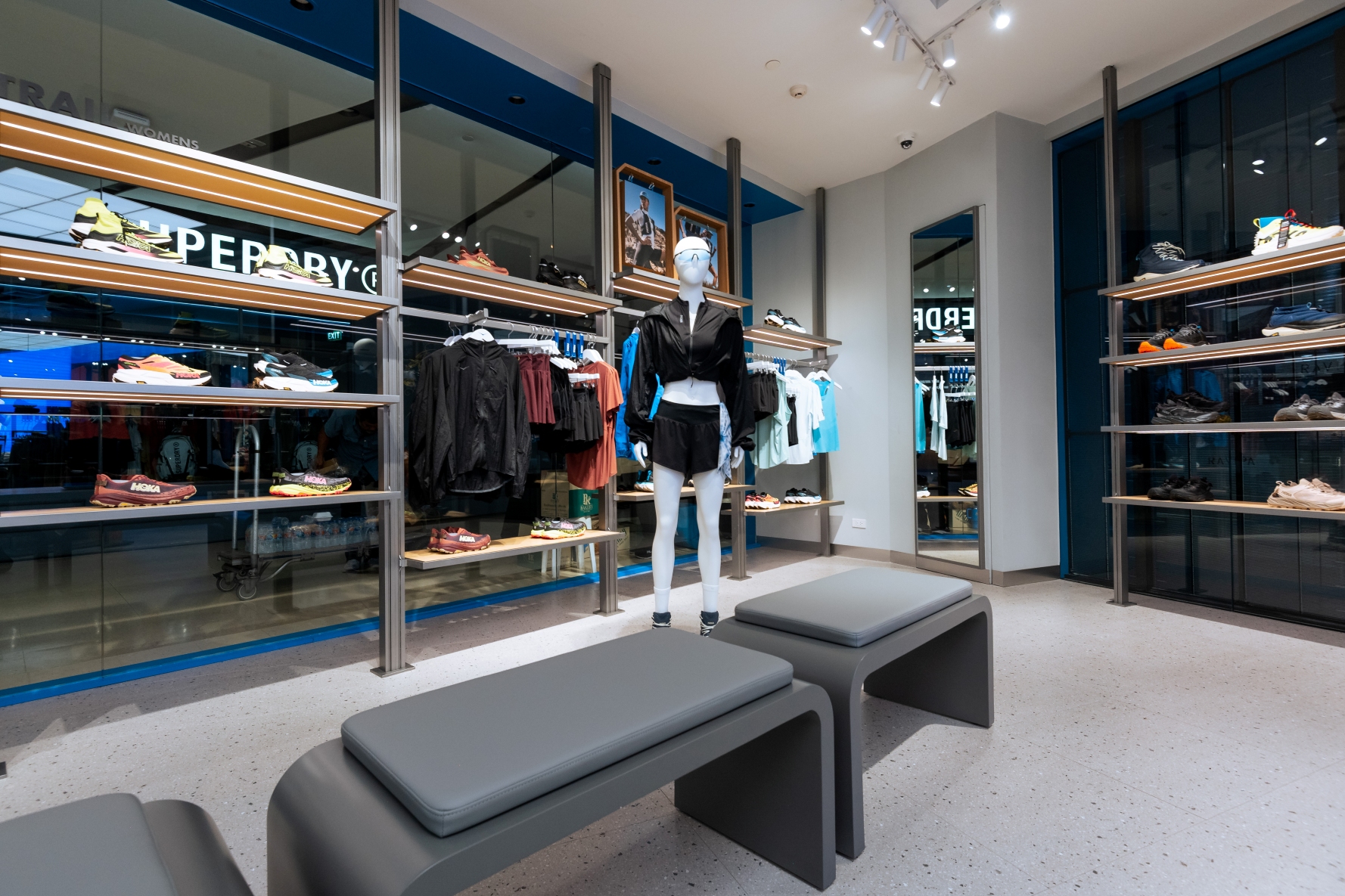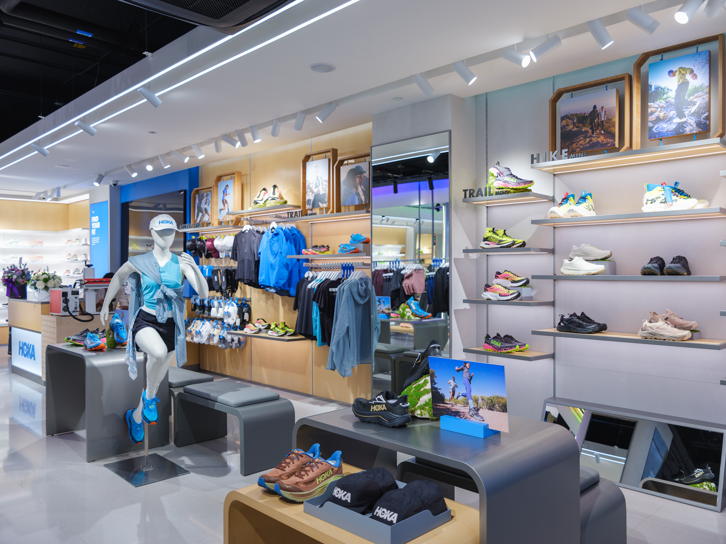 ร้าน HOKA สาขาสยามเซ็นเตอร์ ถูกวางตำแหน่งให้เป็นร้านแบบ Hybrid ที่ผสมผสานสินค้า Performance และ Lifestyle โดยสินค้าในร้านถูกคัดเลือกให้ครอบคลุมทั้งผู้ใช้ที่เน้นประสิทธิภาพสูงสุดสำหรับการวิ่งจริงจัง และผู้ใช้ที่ให้ความสำคัญกับดีไซน์ การแต่งตัว และความเป็นตัวเอง เพื่อตอบโจทย์ทั้งคนรุ่นใหม่ ทั้งกลุ่มนักกีฬาหรือสาย Performance ที่ต้องการรองเท้าคุณภาพสูงสำหรับการเคลื่อนไหวในทุกวัน โดยทางร้านมีสินค้า Performance ครบทุกไลน์ ตอบโจทย์ทั้งสายวิ่งถนนและสายวิ่งเทรล ในขณะเดียวกัน ก็ให้ความสำคัญกับแฟชั่น โดยมีสินค้า Lifestyle ที่หลากหลายกว่าร้านทั่วไปของ HOKA ซึ่งสอดคล้องกับการเติบโตของไลน์สินค้า ‘Performance meets Lifestyle’ ที่แบรนด์กำลังผลักดันอย่างจริงจัง โดยมีสินค้าไฮไลต์ที่ตอบโจทย์ทุกกลุ่มลูกค้าของ HOKA ไม่ว่าจะเป็นรุ่น Trail Lineup, Bondi 9, ไปจนถึง Koshi Tan Tan และด้วยทำเลที่ตั้งใกล้สนามกีฬาแห่งชาติ ร้านนี้จึงกลายเป็นจุดเชื่อมต่อระหว่างนักวิ่ง Run Club นักกีฬา นักศึกษา และผู้บริโภคในย่านสยามที่มองหาไลฟ์สไตล์แบบ Active Urban อย่างแท้จริง ดีไซน์ร้านเน้นความทันสมัย มีกลิ่นอาย Urban ชัดเจน มองทะลุเห็นสินค้าได้ง่าย และออกแบบให้ดึงดูดคนรุ่นใหม่ให้เข้ามาสัมผัสแบรนด์ HOKA ได้ในแบบที่ “เป็นตัวเองมากขึ้น” รวมถึงร้าน HOKA สาขานี้ยังถ่ายทอดตัวตนของแบรนด์ผ่านลาย HOKA และสัญลักษณ์ “นก” อันเป็น Iconic องค์ประกอบเหล่านี้ทำให้ร้านสาขาสยามเซ็นเตอร์เป็นพื้นที่ที่สื่อสารสปิริตของแบรนด์ได้ชัดเจนที่สุด ว่าการเคลื่อนไหวไม่ใช่แค่การออกกำลังกาย แต่คืออิสรภาพ พลัง และแรงบันดาลใจที่ทำให้ “มนุษย์ก็บินได้” ในแบบของตัวเอง