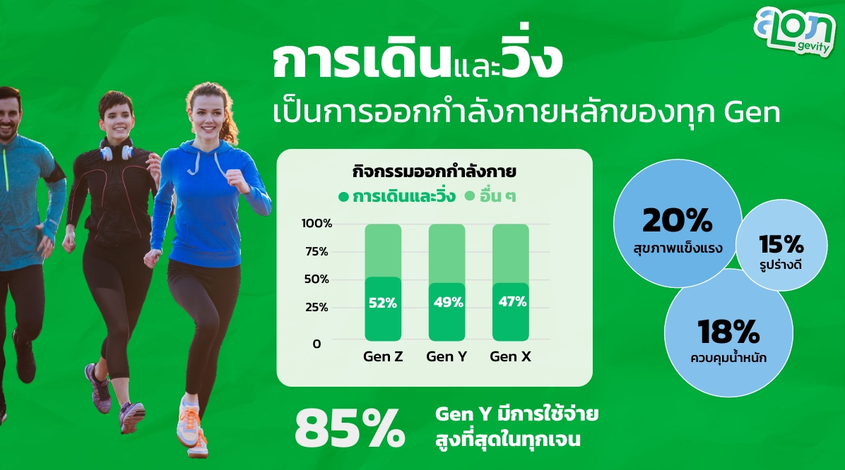 ที่เติบโตมากับโลกดิจิทัลและเปิดรับเทรนด์ใหม่ก่อนใคร นิยมค้นหาข้อมูลสุขภาพผ่านโซเชียลมีเดียเป็นช่องทางหลักในด้านการบริโภค แม้กำลังซื้อยังไม่สูง โดยมีค่าใช้จ่ายด้านอาหารสุขภาพเฉลี่ย 262 บาทต่อมื้อ ค่าใช้จ่ายด้านวิตามินและผลิตภัณฑ์เสริมอาหารเฉลี่ย 2,592 บาทต่อเดือน แต่ก็สะท้อนแนวโน้มความสนใจในการลงทุนเพื่อสุขภาพ ด้านการออกกำลังกาย นิยมกิจกรรมที่ใช้พลังงานสูง โดยเลือกวิ่งมากที่สุด มีแรงจูงใจมาจากต้องการมีสุขภาพแข็งแรงและภาพลักษณ์ที่ดี แต่มีความสม่ำเสมอต่ำกว่าเจเนอเรชันอื่น โดยมีเพียง 61.99% ที่ออกกำลังกายอย่างน้อย 3–4 วันต่อสัปดาห์ ในด้านการดูแลสุขภาพจิต Gen Z  33.83% นิยมผ่อนคลายผ่านงานอดิเรกและกิจกรรมพักใจมากที่สุด สำหรับการเข้าร่วมกิจกรรมกลุ่ม Gen Z 71.33% มองว่าการมีกลุ่มหรือชุมชนช่วยให้ดูแลสุขภาพได้ต่อเนื่อง นอกจากนี้ Gen Z ยังให้ความสำคัญกับการแชร์ประสบการณ์หรือผลลัพธ์จากการเข้าร่วมกิจกรรมผ่านโซเชียลมีเดียมากที่สุด สำหรับความสนใจต่อบริการ Longevity ให้ความสนใจและพร้อมจ่ายน้อยกว่าเจนอื่น