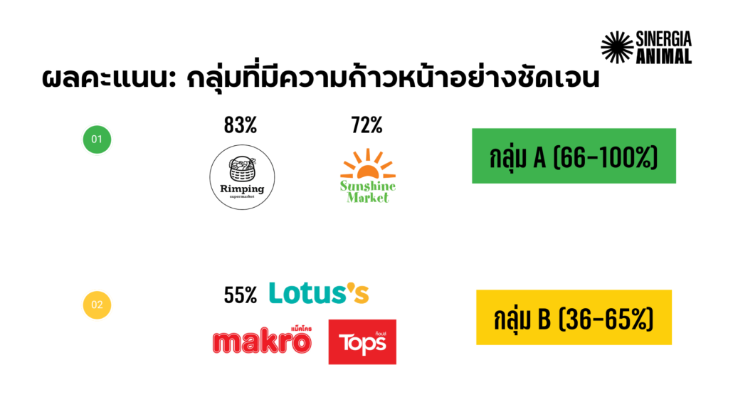 - Sunshine Market – 83% (ระดับ A) มีนโยบายสาธารณะที่แข็งแกร่ง ครอบคลุมทุกแบรนด์และทุกสาขา พร้อมกำหนดช่วงเวลาการเปลี่ยนผ่านที่ชัดเจน