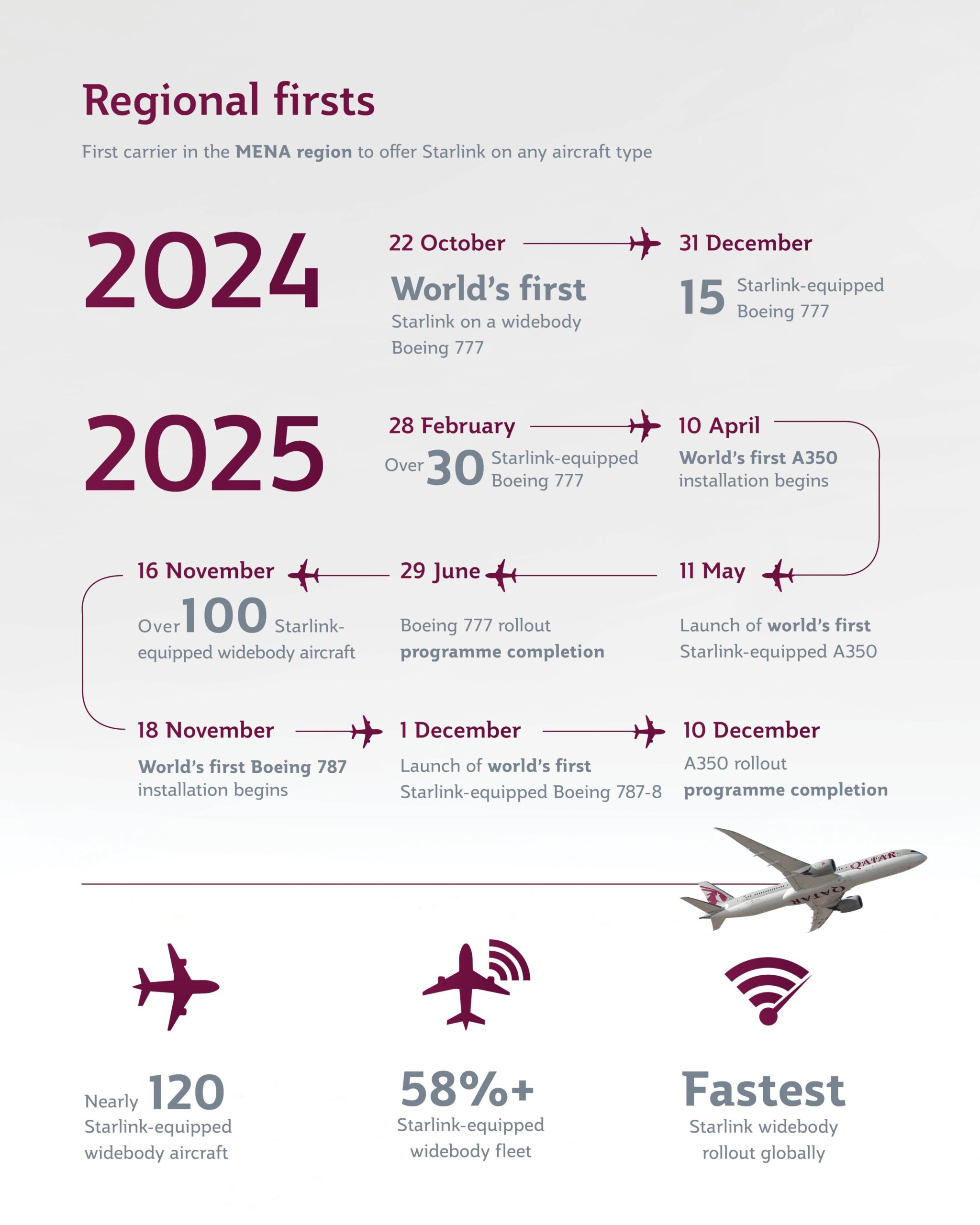 ความสำเร็จครั้งนี้นับเป็นโครงการติดตั้งระบบ Starlink บนเครื่องบินลำตัวกว้างที่รวดเร็วและท้าทายที่สุดในประวัติศาสตร์การบินโลก สายการบินได้ใช้เวลาดำเนินโครงการสั้นที่สุดเพียง 14 เดือน กาตาร์ แอร์เวย์ส สามารถเริ่มต้นและดำเนินการติดตั้งระบบ Starlink บนฝูงบิน โบอิ้ง 777 และ แอร์บัส A350 จนแล้วเสร็จ ก่อนขยายการติดตั้งไปยังเครื่องบินโบอิ้ง 787 Dreamliner