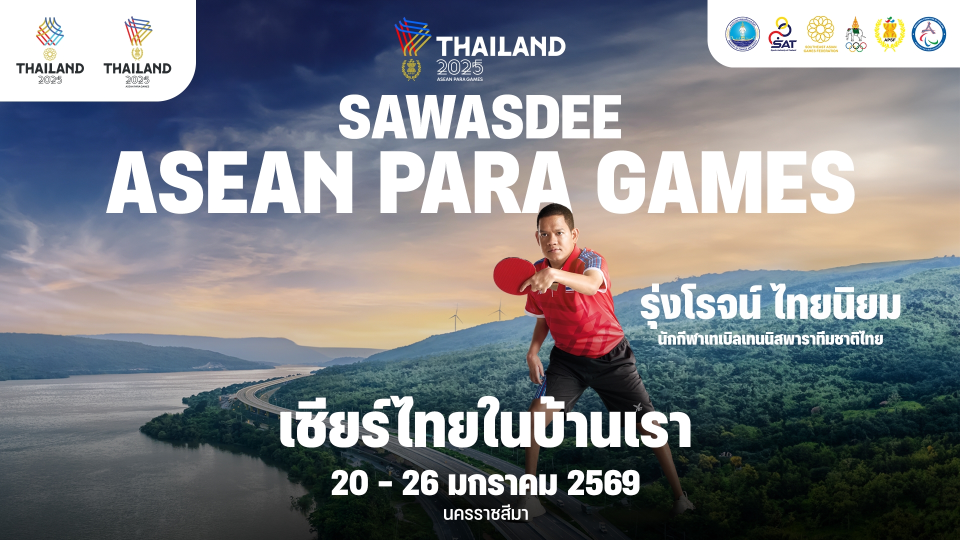 ร่วมเป็นส่วนหนึ่งของประวัติศาสตร์ ขอเชิญชวนคนไทยร่วมส่งแรงใจเชียร์ทัพนักกีฬาไทยในการแข่งขันที่จะมีขึ้น ณ จังหวัดนครราชสีมา ระหว่างวันที่ 20-26 มกราคม 2569 โดยสามารถติดตามการถ่ายทอดสดได้ทาง NBT, T Sports 7, PPTV 36 และ TrueVisions Now รวมถึงติดตามข่าวสารทุกช่องทางออนไลน์ของ Stadium TH