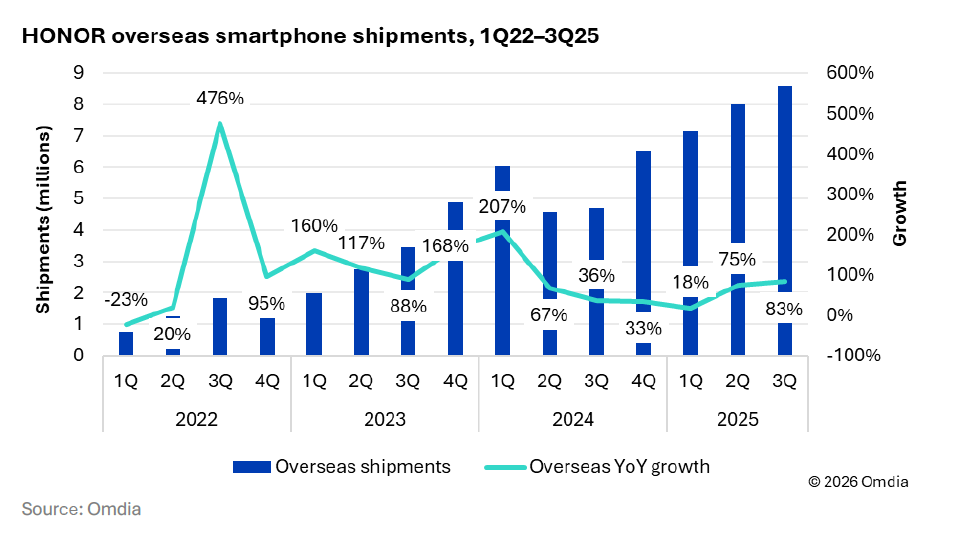 Omdia เผย HONOR ผงาดตลาดโลกปี 2025 ยอดส่งออกโตพุ่ง 55% ขึ้นแท่นแบรนด์ที่ขยายตัวเร็วที่สุดในกลุ่ม Top 10