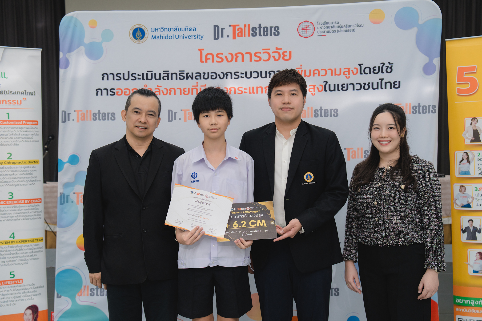 ด้านนางสาวพรรณรังสี เต็มแสวงเลิศ ผู้บริหาร Dr. Tallsters กล่าวเสริมว่า “โครงการนี้สะท้อนถึงวิสัยทัศน์ที่ต้องการยกระดับมาตรฐาน Wellness เยาวชนไทย เราภูมิใจอย่างยิ่งที่เห็นน้องๆ หลายคนในโครงการมีพัฒนาการที่น่าทึ่ง โดยเฉพาะกลุ่มที่สามารถเพิ่มความสูงได้เฉลี่ยถึงเดือนละ 1 เซนติเมตรอย่างต่อเนื่อง ซึ่งนับเป็นผลลัพธ์ที่ยอดเยี่ยมและสร้างความประทับใจให้แก่ทีมวิจัยเป็นอย่างมากและเพื่อเป็นการฉลองความสำเร็จนี้ เราจึงขอมอบรางวัล ‘ยิ่งสูง ยิ่งได้เพิ่ม’ เพื่อต่อยอดความฝันให้น้องๆ โดยหากน้องๆ สูงเพิ่มขึ้นกี่เซนติเมตร เรามอบคอร์สดูแลต่อเนื่องให้ฟรีตามจำนวนเดือนที่เพิ่มขึ้นทันที เช่น น้องที่สูงขึ้น 6 เซนติเมตร ก็จะได้รับสิทธิ์ดูแลต่อเนื่องฟรีถึง 6 เดือนเต็ม ซึ่งโปรแกรมนี้เป็นสิทธิพิเศษแบบ Tailor-made ที่ออกแบบมาเพื่อรักษาระดับการเติบโตให้น้องๆ ก้าวไปสู่เป้าหมายความสูงที่ตั้งไว้ได้อย่างยั่งยืน และสร้างความมั่นใจสูงสุดให้กับผู้ปกครองว่าลูกหลานจะได้รับสิ่งที่ดีที่สุดจากผู้เชี่ยวชาญตัวจริง”