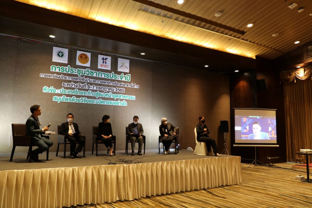 ในวันเดียวกันนี้ มีการเสวนา ประเทศไทยจะก้าวสู่แนวหน้าอุตสาหกรรมสมุนไพรด้วยวิจัยและนวัตกรรมได้อย่างไร โดยรองศาสตราจารย์ ดร. พงศ์พันธ์ แก้วตาทิพย์ รองผู้อำนวยการ สกสว. และผู้อำนวยการสำนักพัฒนาระบบ ววน., ดร. สิวินีย์ สวัสดิ์อารี สถาบันมาตรวิทยาแห่งชาติ และอนุกรรมการ และเลขานุการคณะอนุกรรมการแผนงานโครงสร้างพื้นฐานทางคุณภาพของประเทศ บพข., ภก. คณิตศักดิ์ จันทราพิพัฒน์ ผู้อำนวยการกลุ่มภารกิจสนับสนุนการเข้าถึงบริการปฐมภูมิและการสร้างเสริมสุขภาพและป้องกันโรค สำนักงานหลักประกันสุขภาพแห่งชาติ (สปสช.), ภก. วราวุธ เสริมสินสิริ ผู้อำนวยการกองยุทธศาสตร์และแผนงาน สำนักงานคณะกรรมการอาหารและยา และ คุณเมธา สิมะวรา นายกสมาคมผู้ผลิตยาสมุนไพร ประธานกลุ่มสมุนไพร สภาอุตสาหกรรมแห่งประเทศไทย