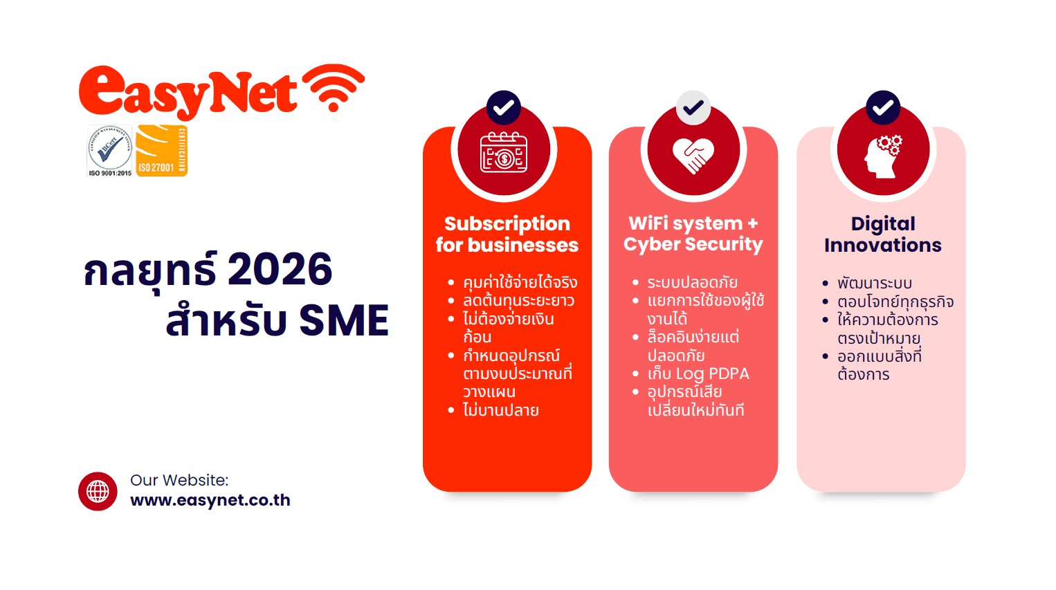 บริษัท อีซี่ เน็ต (ไทยแลนด์) จำกัด ผู้เชี่ยวชาญการด้านวางระบบ Network และ ไอที โซลูชันเต็มรูปแบบอย่างครบวงจรโดยได้การรับรองจาก ISO9001 : 2015 และ ISO27001 นำโดย นายโกวิท ธารีรัตนาวิบูลย์ ประธานเจ้าหน้าที่บริหาร พร้อมด้วยนางวาณา ธารีรัตนาวิบูลย์ ประธานเจ้าหน้าที่ฝ่ายการตลาด และนายพงศภัค ธารีรัตนาวิบูลย์ ประธานเจ้าหน้าที่ฝ่ายปฏิบัติการ จัดงานแถลงข่าว “เปิดกลยุทธ์ EasyNet 2026: เพื่อนคู่คิดทางเทคโนโลยีของ SME” มุ่งเป้าขับเคลื่อนเศรษฐกิจดิจิทัลของไทยผ่านโมเดล “เช่าระบบ WiFi พร้อมอุปกรณ์แบบครบวงจร” (WiFi as a Service) เพื่อทลายขีดจำกัดด้านงบประมาณและเพิ่มขีดความสามารถในการแข่งขันให้กับผู้ประกอบการทุกระดับ