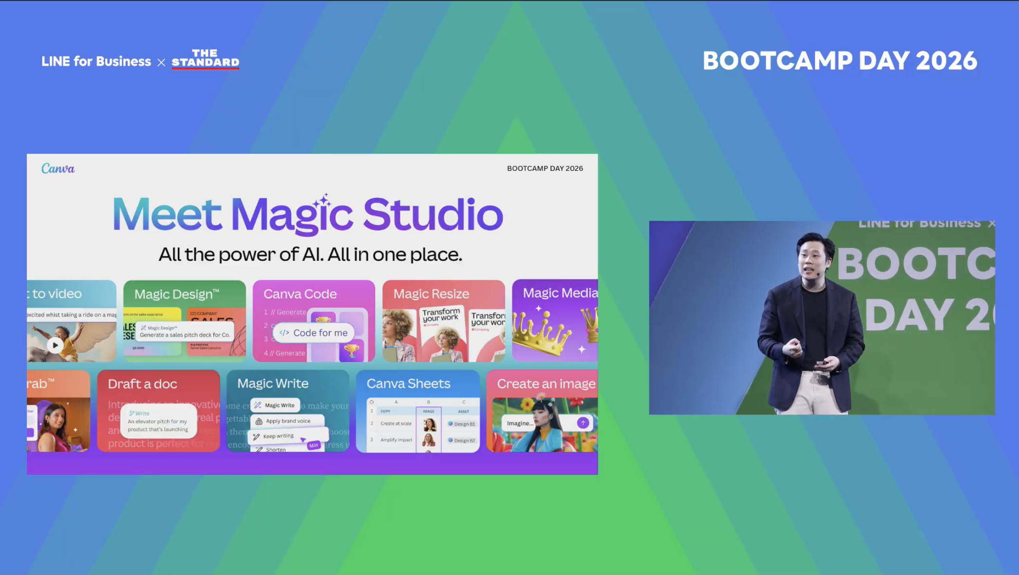 ด้านงานดีไซน์และครีเอทีฟ ก็มีเทคโนโลยีให้ผู้ประกอบการเลือกใช้ได้ตามความถนัด โดย คุณภัคพล ตั้งตงฉิน Country Manager จาก Canva ได้นำเสนอเครื่องมือสำเร็จรูปอย่าง Magic Studio พร้อมให้ SME ไทยสร้างสรรค์งานดีไซน์เองได้ง่าย ๆ ด้วยพลัง AI มาคอยเสริมใน 3 ด้านหลัก คือ 1) System ช่วยสร้างตัวตน คาแรคเตอร์ของแบรนด์ให้ชัดเจน เป็นระบบระเบียบสอดคล้องกัน เพื่อให้คนจดจำได้ 2) Speed ช่วยสร้างงานดีไซต์ได้อย่างรวดเร็ว ตรงโจทย์ทันใจ แต่ทั้งนี้ ผู้ใช้ควรต้องมีการเขียน Prompt ที่ชัดเจนเพื่อให้ระบบเข้าใจ และ 3) Scale ช่วยต่อยอดครีเอทีฟที่สร้างไว้สู่งานดีไซน์ในหลากหลายขนาด หลากหลายรูปแบบ รองรับการโพสต์ในหลากหลายแพลตฟอร์ม ถือเป็นเครื่องมือหนึ่งที่ตอบโจทย์ SME ไทย ช่วยเปลี่ยนความคิดสร้างสรรค์ให้จับต้องได้ทุกธุรกิจ