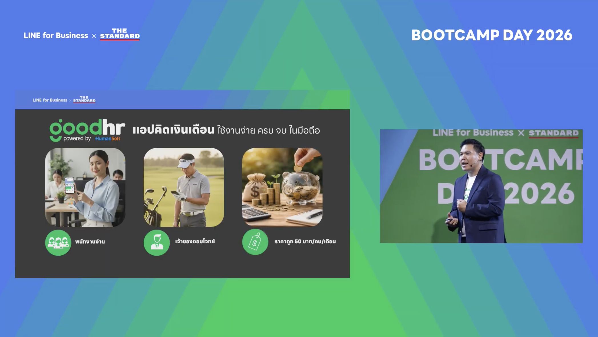 อีกหนึ่งประเด็นสำคัญสำหรับผู้ประกอบการคือ การใช้เทคโนโลยีบริหารจัดการทั้งงานและทีมไปในเวลาเดียวกันให้มีประสิทธิภาพ โดย คุณอัษฎาวุธ จิตตเสถียร ผู้บริหารบริษัท Humansoft ได้ชี้แนะถึงการเลือกซอฟต์แวร์ที่เข้ามาช่วยธุรกิจ ควรเริ่มจาก 3 แกนหลัก ได้แก่ งานขาย งานบัญชี และงานบุคคล โดย Humansoft ได้พัฒนา GoodHR โซลูชันช่วย SME ไทยในการบริหารจัดการด้าน HR ไม่ว่าจะเป็นการจ่ายเงินเดือน การจ้างพนักงานและบริหารสวัสดิการ เช่น คำนวณเงินเดือน ออกสลิปเงินเดือน ตรวจสอบเวลาเข้า-ออกงาน หรือพนักงานทำเรื่องเอกสารใบลาและใบ OT ให้เป็นไปอย่างราบรื่น ลดขั้นตอนซ้ำซ้อน และประหยัดเวลา เจ้าของธุรกิจสามารถจัดการผ่านแอปฯ เพื่อความครบครัน ในขณะที่พนักงานสามารถเข้าถึงและจัดการขั้นตอนสำคัญผ่าน LINE ได้ง่าย ๆ ให้ทั้งองค์กรสามารถบริหารงานบุคลากรได้ครบ จบบนมือถือแบบเรียลไทม์ได้อย่างสะดวก