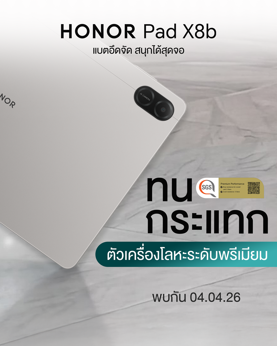 ออเนอร์ (HONOR) ผู้นำด้านอุปกรณ์อัจฉริยะระดับโลก เดินหน้าเขย่าตลาดแท็บเล็ตอีกครั้งด้วยการเตรียมเปิดตัว HONOR Pad X8b ชูคอนเซปต์ “แบตอึดจัด สนุกได้สุดจอ” ที่ผสานทั้งดีไซน์พรีเมียมและประสิทธิภาพไว้อย่างลงตัว เพื่อตอบโจทย์การใช้งานในทุกมิติ ไม่ว่าจะเป็นนักเรียน นักศึกษา คนทำงานรุ่นใหม่ หรือสายฟรีแลนซ์ที่ต้องการอุปกรณ์คู่ใจเพียงเครื่องเดียว ครบทั้งเรียน ทำงาน และความบันเทิง โดดเด่นด้วยหน้าจอ HONOR Eye Comfort FullView ขนาด 11 นิ้ว เสริมความอึดด้วยแบตเตอรี่ความจุ 10,100mAh ที่พร้อมลุยได้ตลอดวัน พร้อมโครงสร้างตัวเครื่องโลหะระดับพรีเมียม แข็งแรงทนทาน ผ่านการรับรองมาตรฐานความแกร่งระดับ 5 ดาวจาก SGS ประเทศสวิตเซอร์แลนด์ เตรียมเผยราคาอย่างเป็นทางการในประเทศไทยวันที่ 4 เมษายน 2569 พร้อมรับโปรโมชันและข้อเสนอพิเศษมากมาย