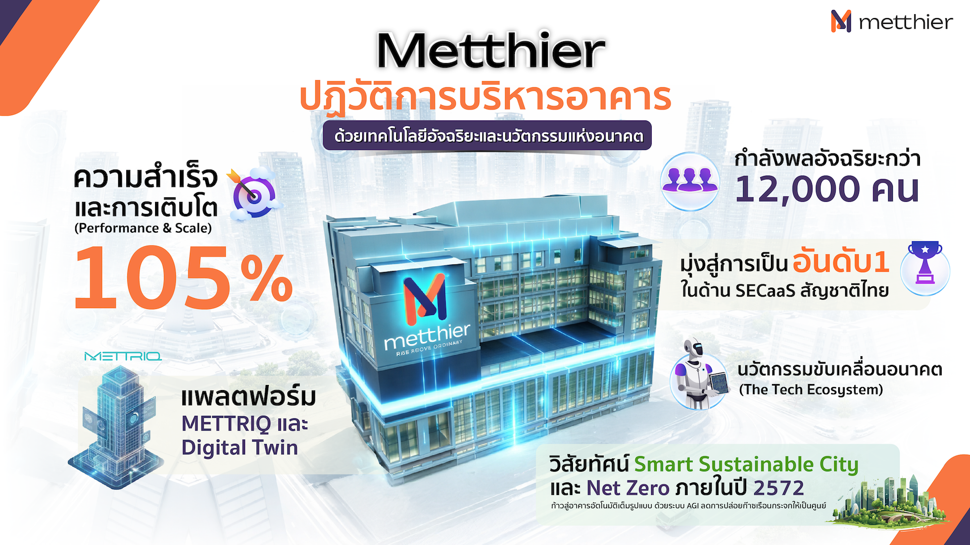 นอกจากนี้ Metthier ยังเดินหน้าพัฒนาระบบอาคารอัตโนมัติ พร้อมขับเคลื่อน Net Zero Building เพื่อลดการปล่อยก๊าซเรือนกระจกสุทธิเป็นศูนย์ สอดคล้องกับทิศทางการดำเนินธุรกิจขององค์กร และเป้าหมายด้านความยั่งยืนในระดับสากลและประเทศไทย โดยจะนำ AGI (Artificial General Intelligence) มาประยุกต์ใช้ในภาคธุรกิจอย่างเต็มตัว เพื่อเชื่อมสู่การสร้าง Smart Sustainable City ที่มีระบบบริหารจัดการและตัดสินใจได้ด้วยตัวเองอย่างอัจฉริยะ ซึ่งไม่เพียงช่วยสร้างมูลค่าเพิ่มทางธุรกิจอย่างยั่งยืน แต่ยังเป็นการยกระดับคุณภาพชีวิตของคนในสังคม พร้อมสร้างความได้เปรียบและเพิ่มขีดความสามารถทางการแข่งขันของประเทศไทยในเวทีโลก