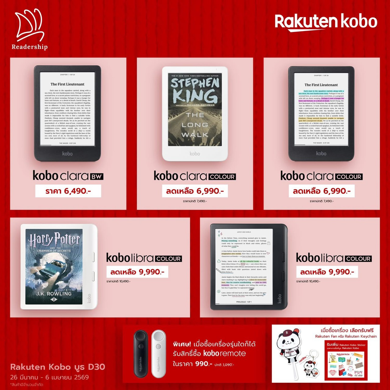 สำหรับการร่วมเป็นพันธมิตรอย่างเป็นทางการกับ ราคุเทน โคโบ นับว่าเป็นก้าวสำคัญ ที่ช่วยขยายฐานผลิตภัณฑ์  พร้อมทั้งยังช่วยสนับสนุนการไปสู่เป้าหมายด้านการเติบโตอย่างยั่งยืนในการส่งเสริมการใช้เครื่องอ่านอีบุ๊กเพื่อช่วยลดการใช้กระดาษ และตอบโจทย์ ESG ที่ผู้บริโภคให้ความสำคัญมากขึ้น ยิ่งไปกว่านั้นยังทำให้นักอ่านไทยได้สัมผัสกับผลิตภัณฑ์คุณภาพแบรนด์ระดับโลก ที่เป็นของแท้ทั้งเครื่องและอุปกรณ์ มีการรับประกันสินค้าและบริการหลังการขายจากผู้จัดจำหน่ายที่น่าเชื่อถือ ส่วนในการจัดจำหน่ายนั้น สามารถสั่งซื้อได้ผ่านทาง Readership.me , ร้าน B2S และ Marketplace ชั้นนำในเร็วๆ นี้ ส่วนโปรโมชั่นพิเศษเนื่องในโอกาสการเปิดตัวครั้งแรกจะจัดขึ้นที่งานสัปดาห์หนังสือแห่งชาติ ครั้งที่ 54 บู๊ธเลขที่ D30 ตั้งแต่วันนี้ – 6 เมษายน 2569 ณ ศูนย์การประชุมแห่งชาติสิริกิติ์  โดย Kobo Libra Colour จากปกติ 10,490 บาท ราคาพิเศษในงาน 9,990 บาท พร้อมรับอุปกรณ์เสริม Case,Stylus หรือ Remote ส่วน Kobo Clara Colour จากปกติ 7,490 บาท ราคาพิเศษในงาน 6,990 บาท และ Kobo Clara BW หน้าจอขาวดำ ในราคา 6,490 บาท พร้อมเคสหลายสีให้เลือกตามสไตล์