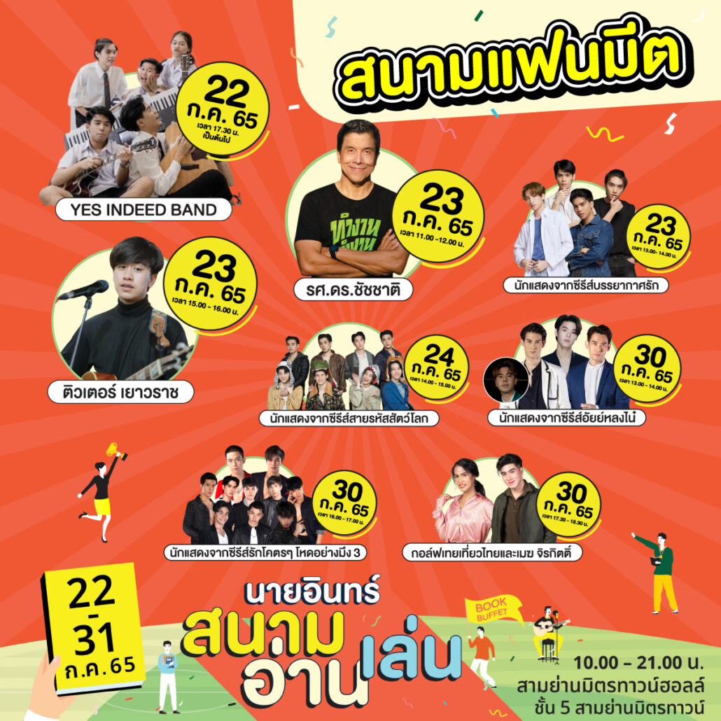 - สนามกระชับมิตรรักนักอ่าน: ชวนมิตรมาพบปะนักเขียนพร้อมแจกลายเซ็นต์ กิจกรรมแนะนำหนังสือ และเรื่องเล่าจากหนังสือดัง