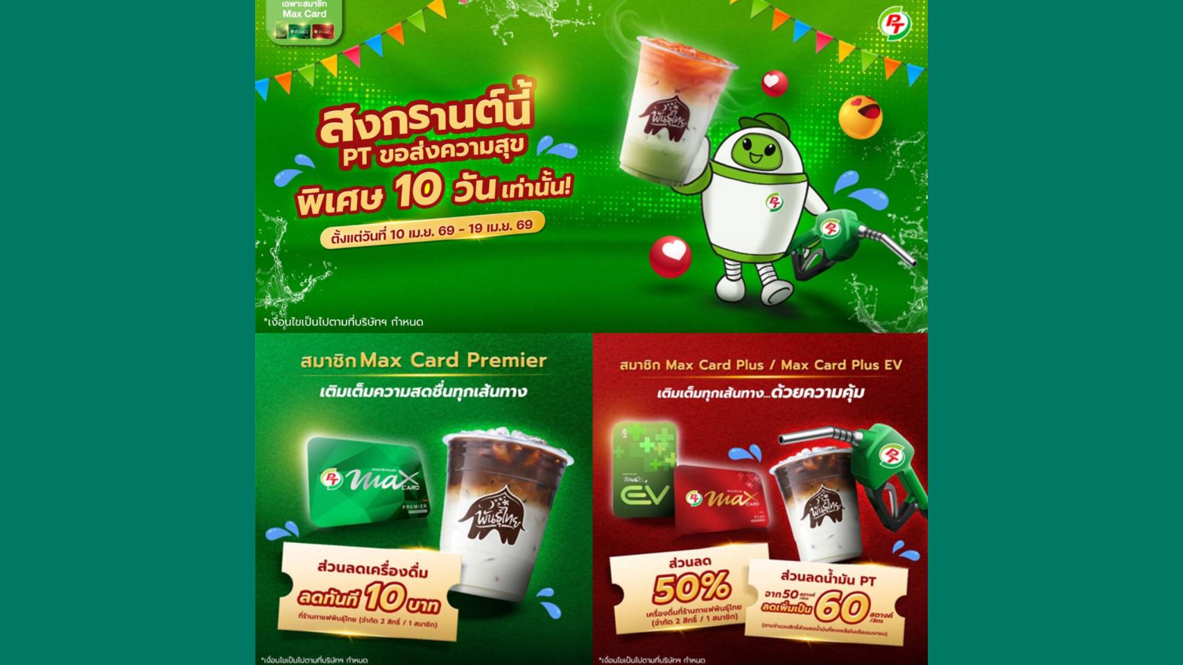 พีที ส่งแคมเปญ “สงกรานต์นี้ พีที ขอส่งความสุข 10 วัน” มอบสิทธิพิเศษสมาชิก Max Card เติมเต็มความคุ้มค่าทุกเส้นทาง