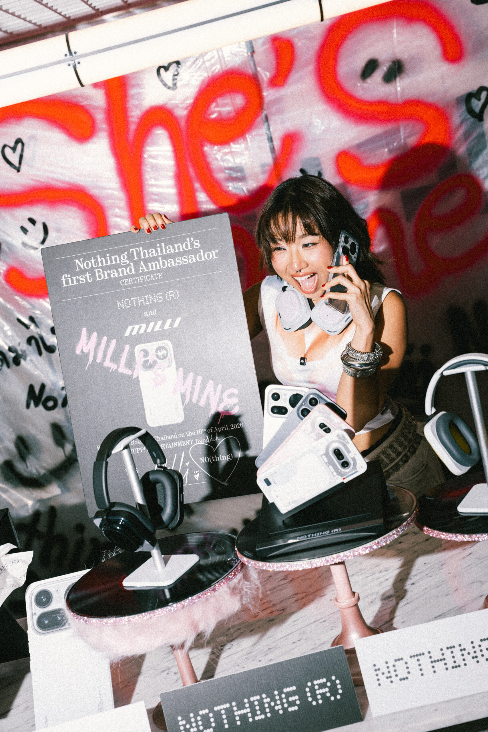 ทุกอย่างเริ่มต้นจากงานเปิดตัว Phone (4a) Series และ Headphone (a) เมื่อวันที่ 24 มีนาคม 2569 ซึ่งเป็นจุดที่ MILLI และ Nothing ได้เจอกันครั้งแรก และออร่าของ MILLI ดันสะดุดตาแบรนด์เข้าอย่างจัง โดยในงานพิธีสู่ขอ Brand Ambassador วันนี้ นายพลภัทร สายบัวทอง ผู้อำนวยการประจำ Nothing แห่งประเทศไทย เผยเหตุผลถึงที่มาที่ไปของงานนี้ ว่า Nothing Thailand สนใจ MILLI มาตั้งแต่ปีที่ผ่านมา และในปีนี้เรากล้าที่จะเดินหน้าจองตัวน้องนวยมาเป็น Brand Ambassador เพราะหลังเปิดขาย Phone (4a) Series และ Headphone (a) ไปเมื่อไม่นานมานี้เราสามารถทำยอดขายได้ทะลุเป้าจนสามารถเก็บเงินมาสู่ขอ MILLI ได้สำเร็จ และแน่นอนว่าไม่ใช่แค่ความรักอย่างเดียว แต่ MILLI คือคนที่ไม่เคยหยุดเป็นตัวเอง กล้าพูด กล้าแสดงออก และกล้าทำในสิ่งที่คนอื่นยังลังเล ซึ่งนั่นคือสิ่งเดียวกันกับที่ Nothing ยืนหยัดมาตลอดตั้งแต่วันแรก และในปีนี้ Nothing Thailand พร้อมแล้วที่จะเดินหน้าจองตัวน้องนวย การจับมือครั้งนี้จึงถือเป็นการรวมกันของสองพลังที่พูดภาษาเดียวกัน นั้นคือภาษาของคนที่กล้าจะแตกต่าง แน่นอนว่าสิ่งนี้จึงทำให้ Nothing แห่ขันหมากมาสู่ขอ “จองตัว MILLI มาเป็น Brand Ambassador คนแรกของ Nothing Thailand”