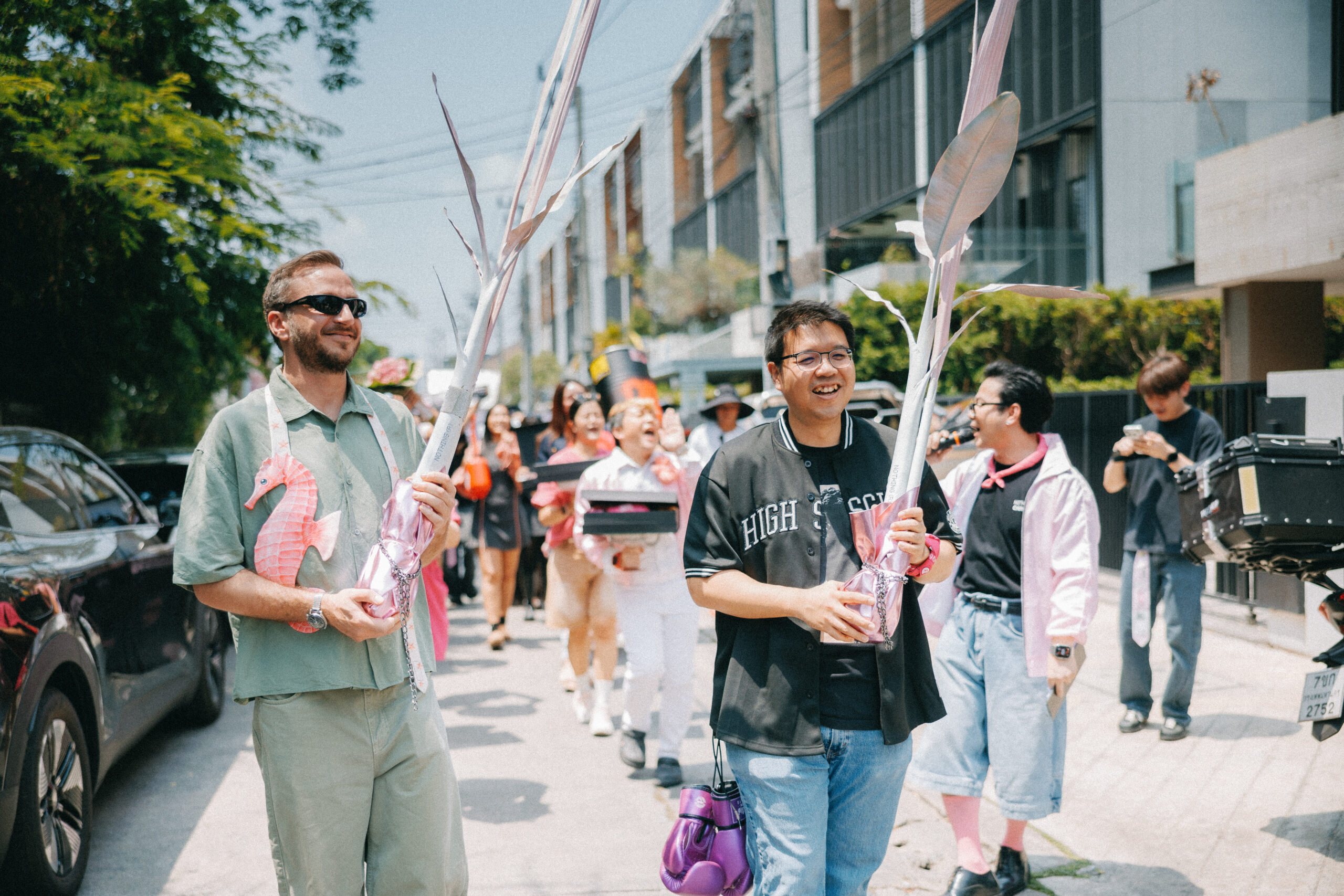 Nothing Thailand เลือกหยิบพิธีที่คุ้นเคยนี้มาตีความใหม่ในแบบที่กล้าและร่วมสมัยกว่าเดิม โดยไม่ได้ทิ้งกลิ่นอายของวัฒนธรรมไทยไปแม้แต่น้อย ตรงกันข้าม กลับยิ่งทำให้มันมีชีวิต มีสีสัน และมีความหมายมากขึ้นกว่าเดิมด้วยซ้ำ ขบวนแห่ขันหมากที่ถูกนำมาปรับให้ร่วมสมัย และออกแบบมาอย่างตั้งใจเพื่อบอกว่า “เราจริงจัง แบบที่เราก็ยังเป็นตัวเอง” และนั่นคือสิ่งที่ทำให้งานนี้ไม่ธรรมดา เพราะมีการผสมผสาน ความสนุกเข้ากับการตีความหมายในรูปแบบใหม่ และความเป็น